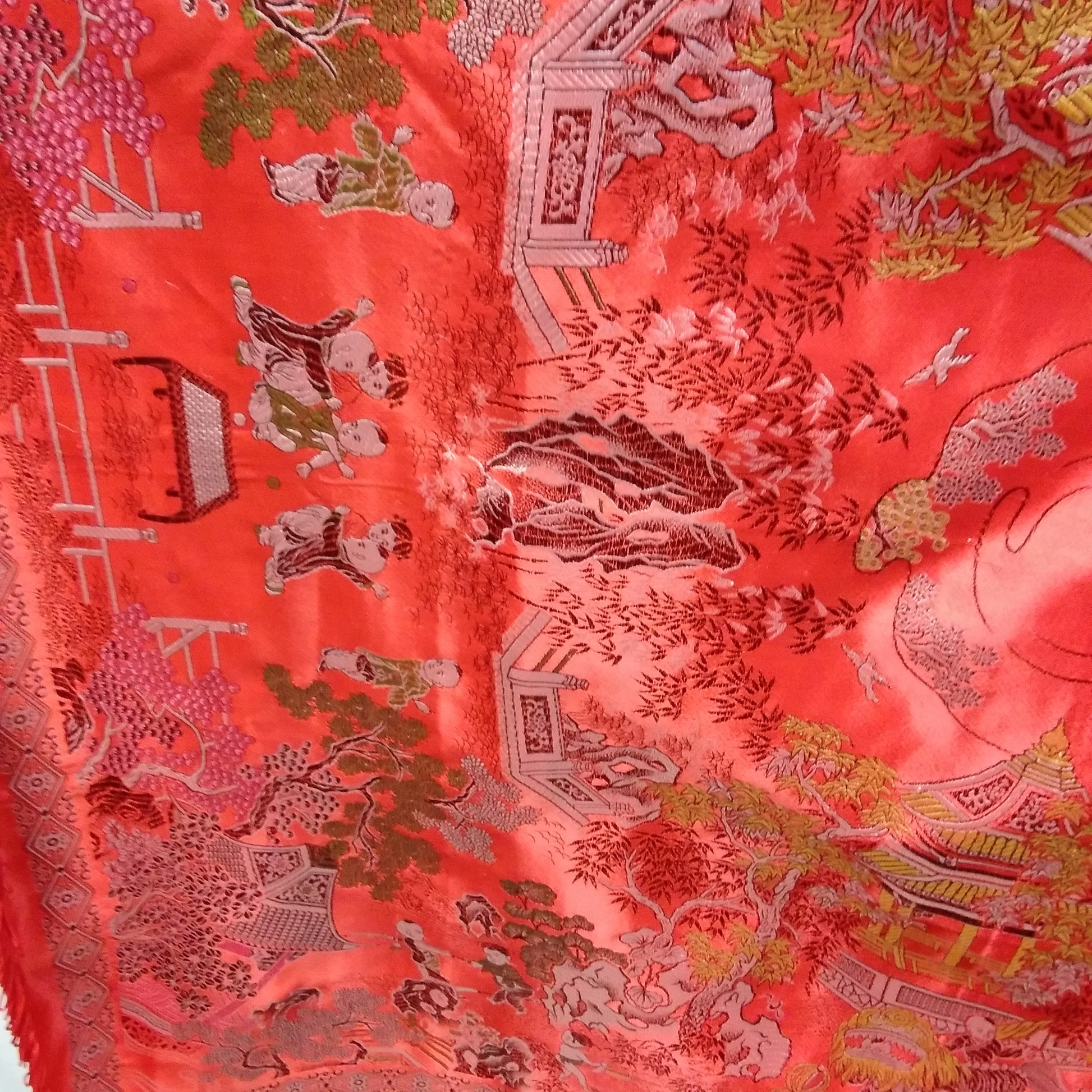 Brocaded Flowers Chinese Silk Embroidered Red Tapestry Cloth With Fringe - Nice table shawl composed of children playing and engaged in martial arts training.