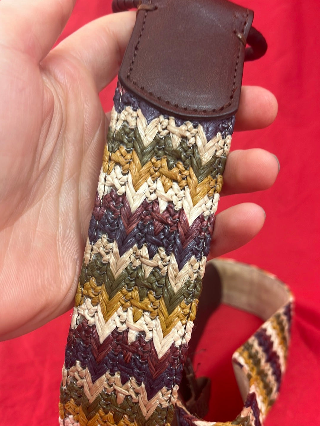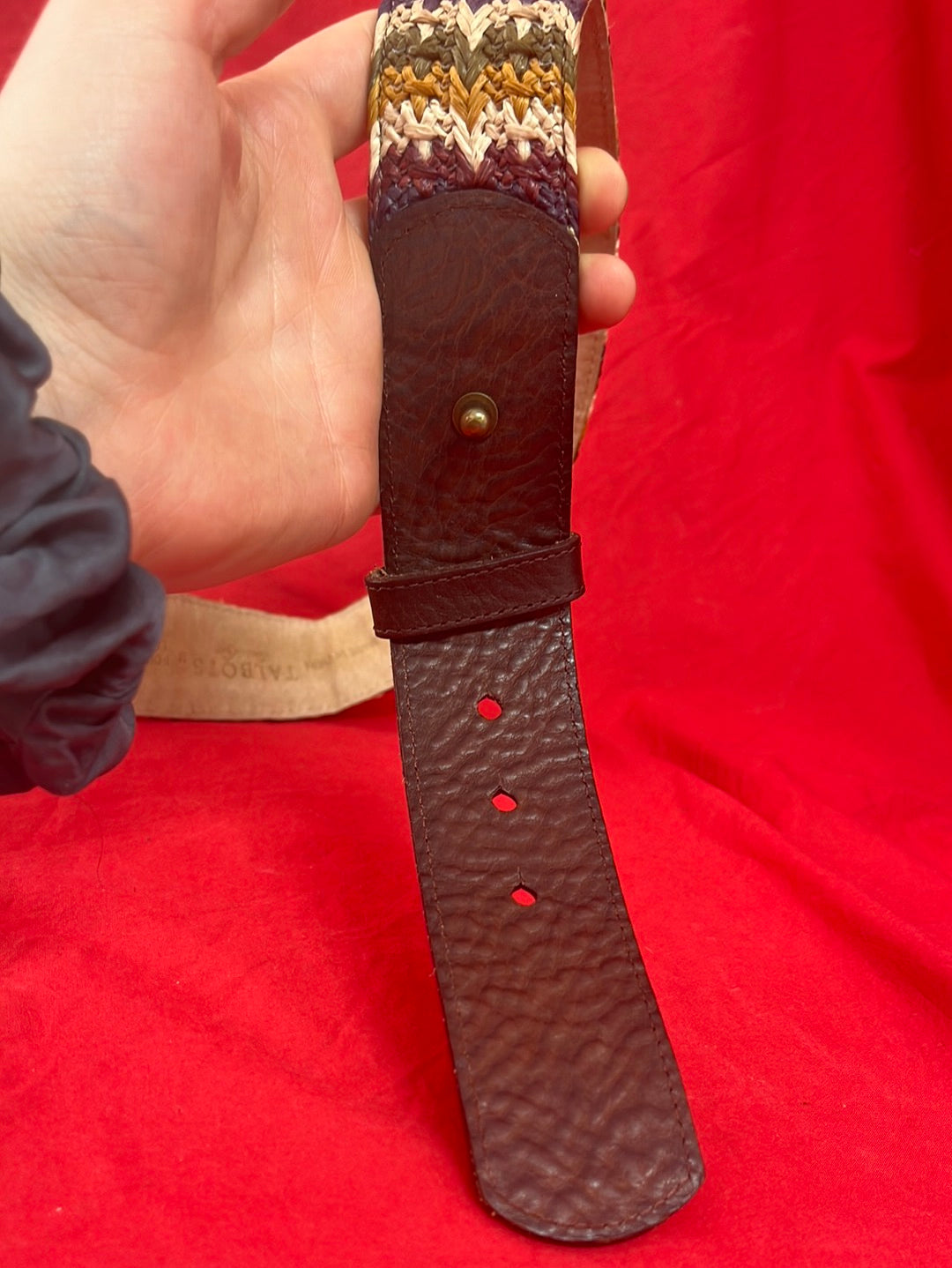 Jagged bands of maroon, purple, drk green, yellow and ivory decorate the outer face of this belt. Dark brown leather ends and buckle.