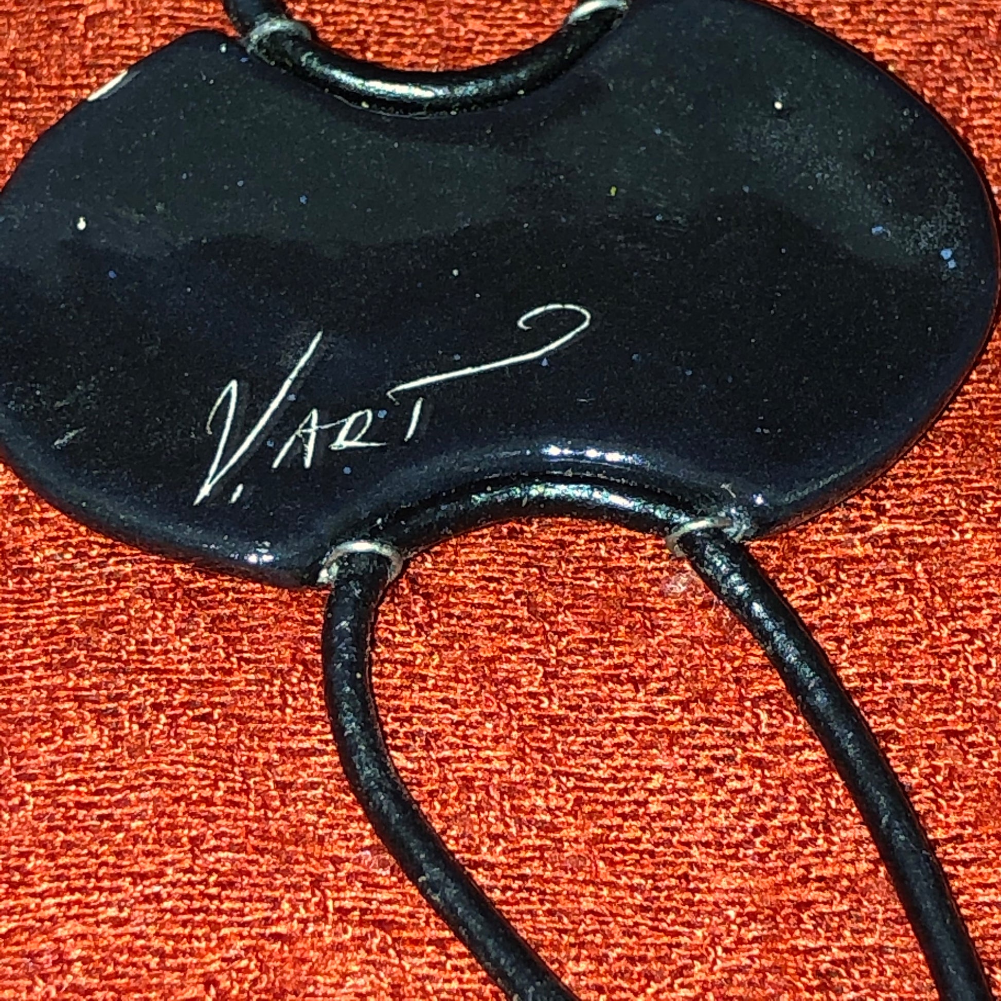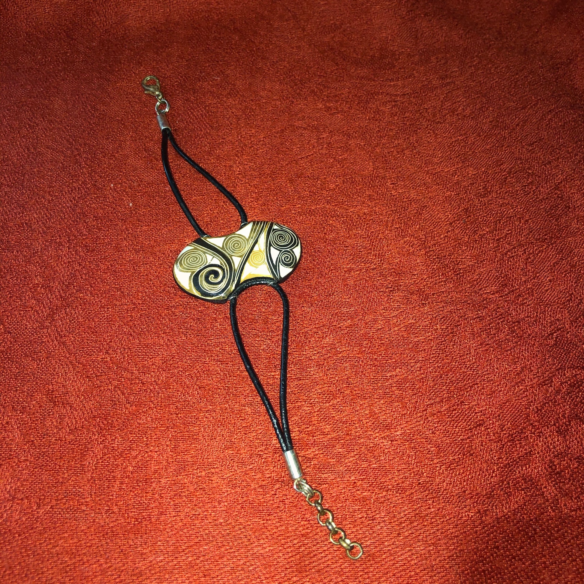 Unique handcrafted and hand painted bracelet. Bracelet is signed by artist with hand painted face and leather straps. Item is in good condition with a small chip and discolored bracelet closure.