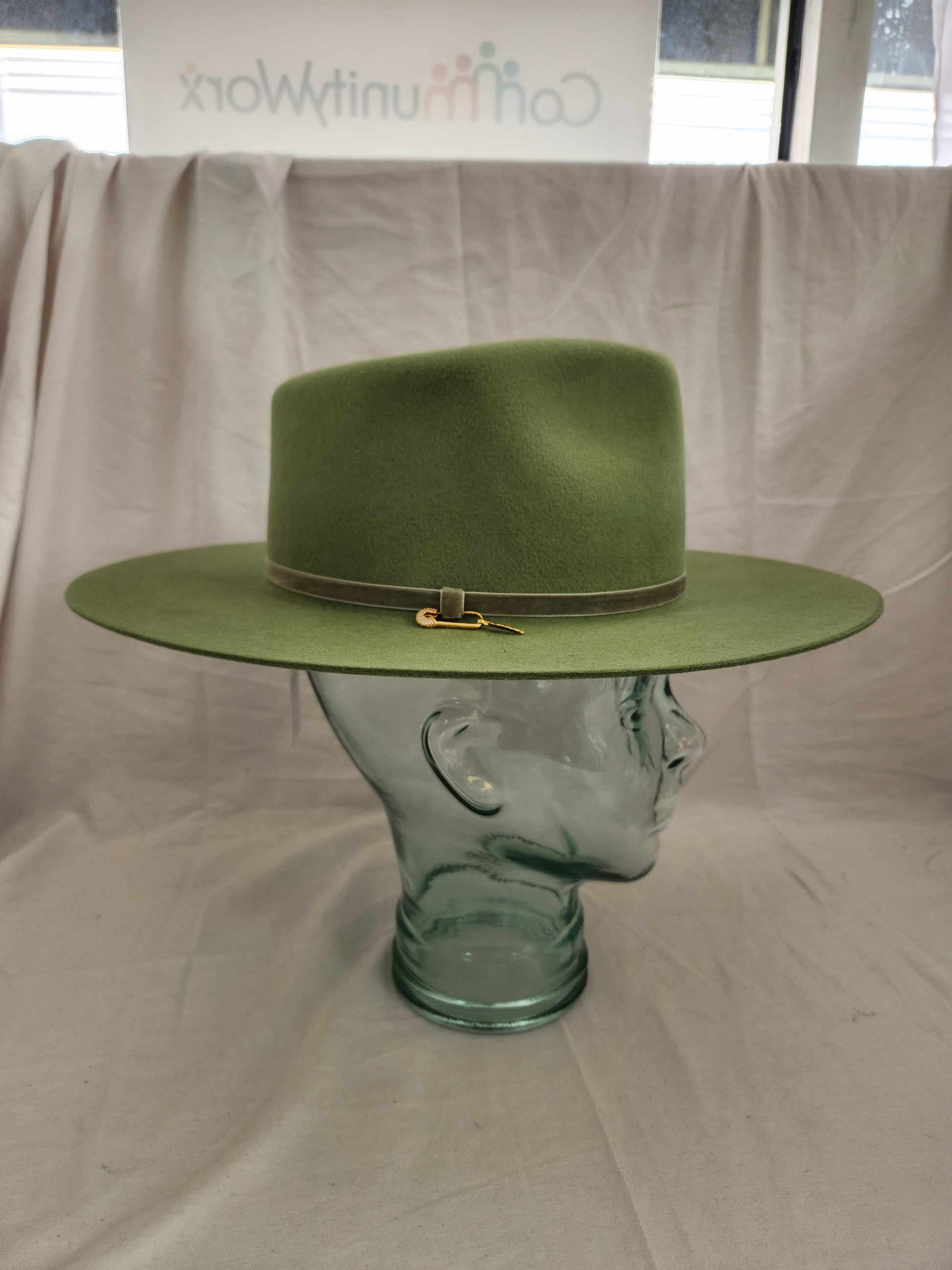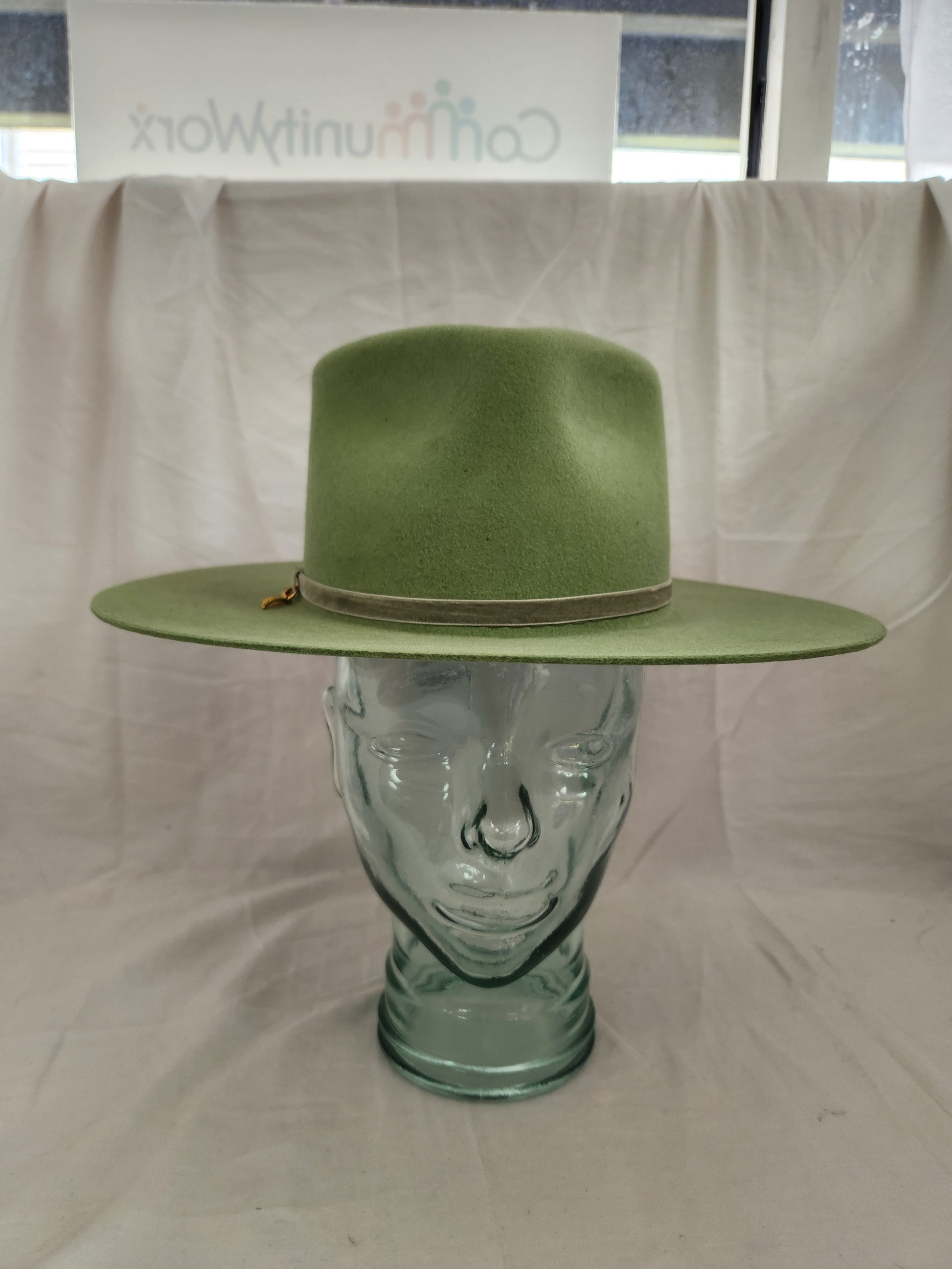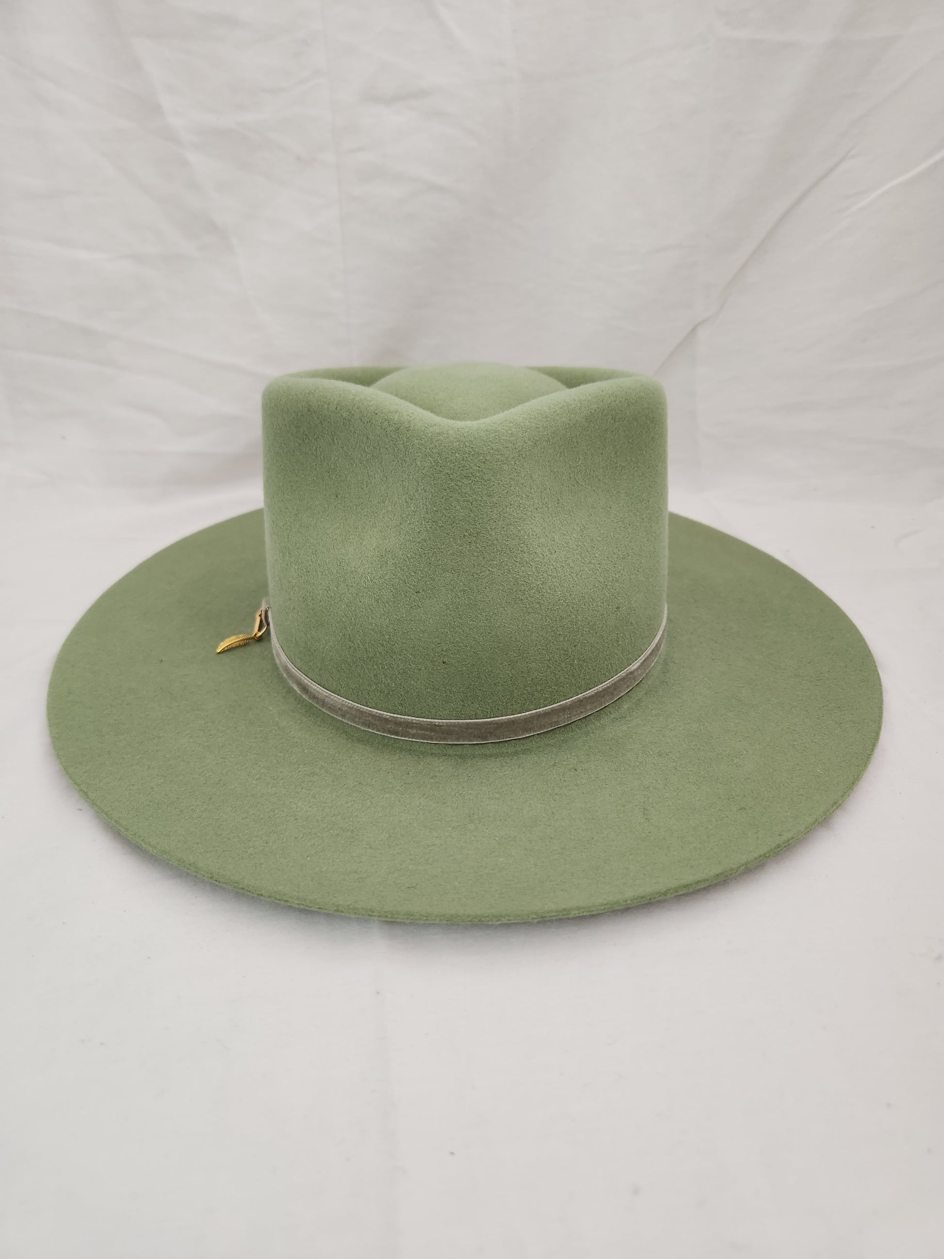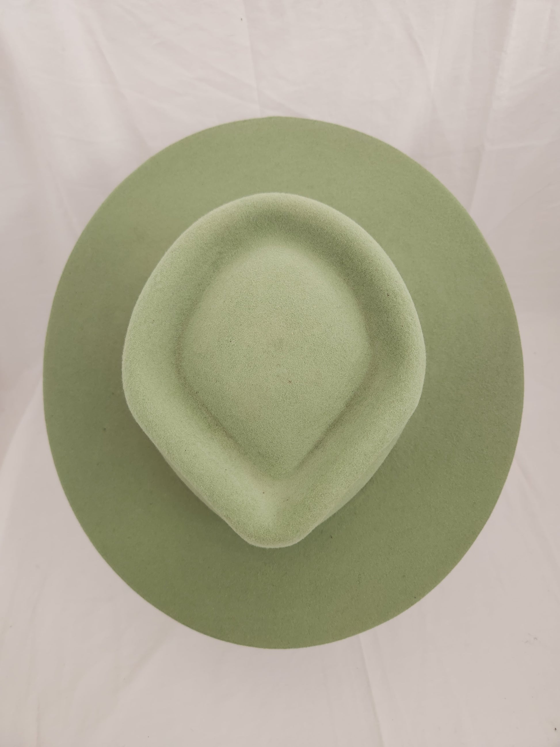 Experience luxury and style with our Stem Green Wool Hat. Made from 100% finest Bolivian wool, this hat features a green velvet ribbon, a small gold crystal pin and gold feather pendant for added elegance. The interior boasts a 100% goatskin sweatband and satin lining. With a rigid crown and brim, this hat is spot cleanable and offers a brim of 8.5cm and a crown of 11.5cm. Handcrafted with love in Mexico and designed in California. Elevate your wardrobe with this timeless piece.