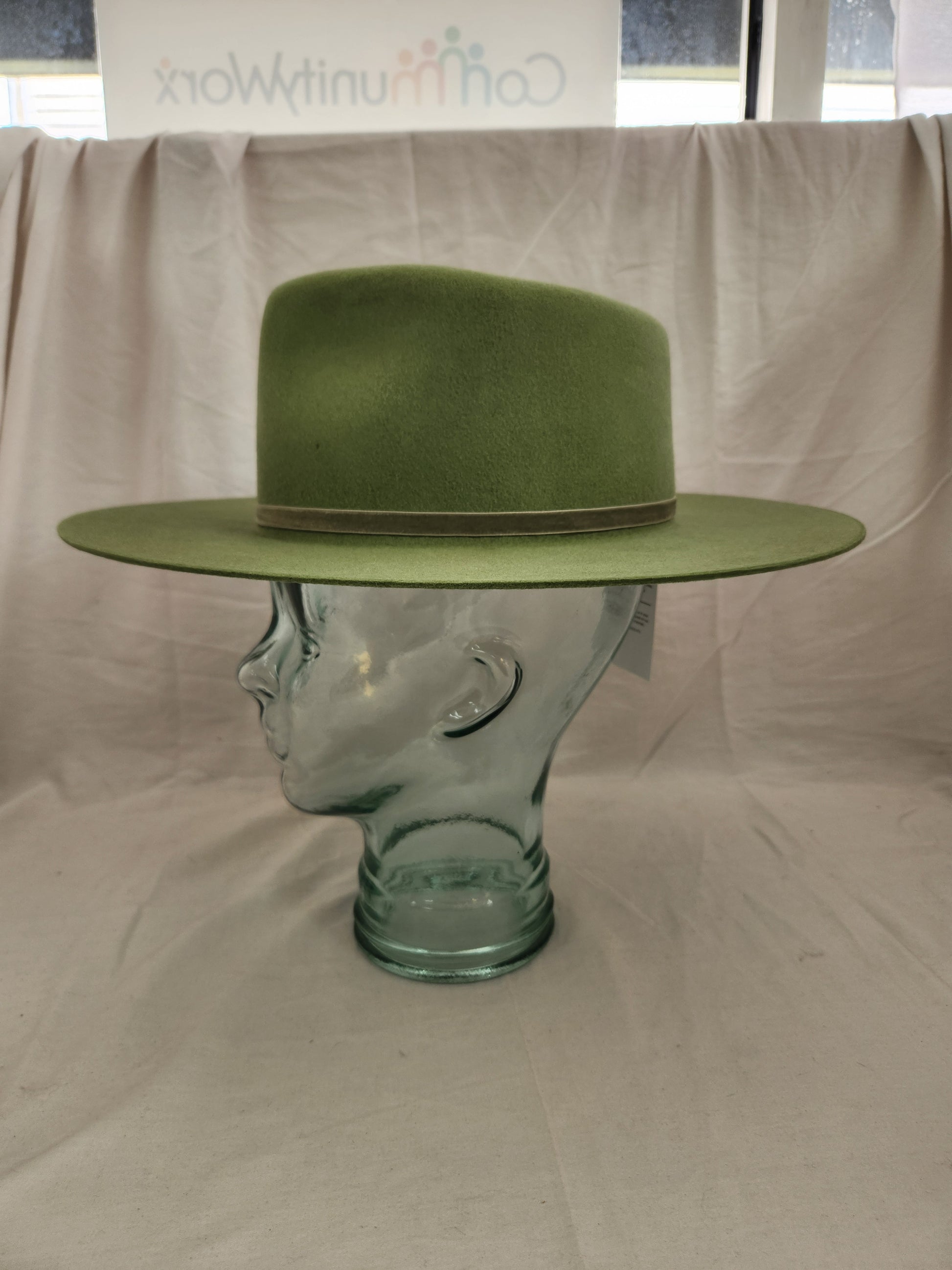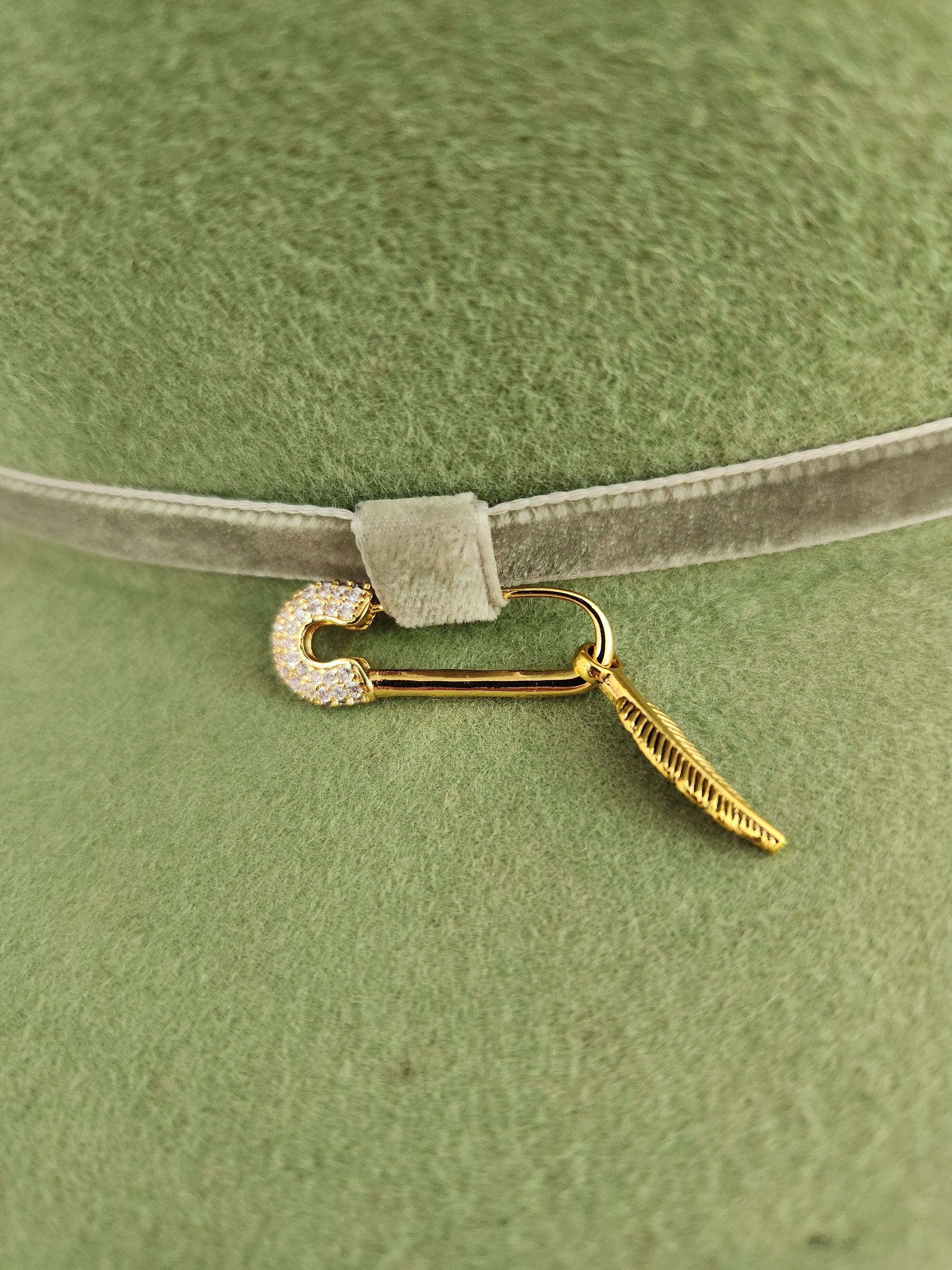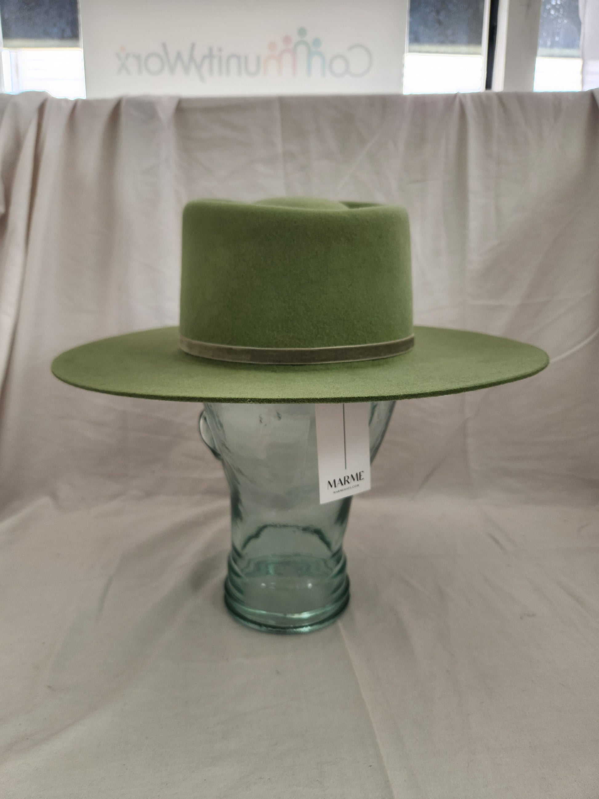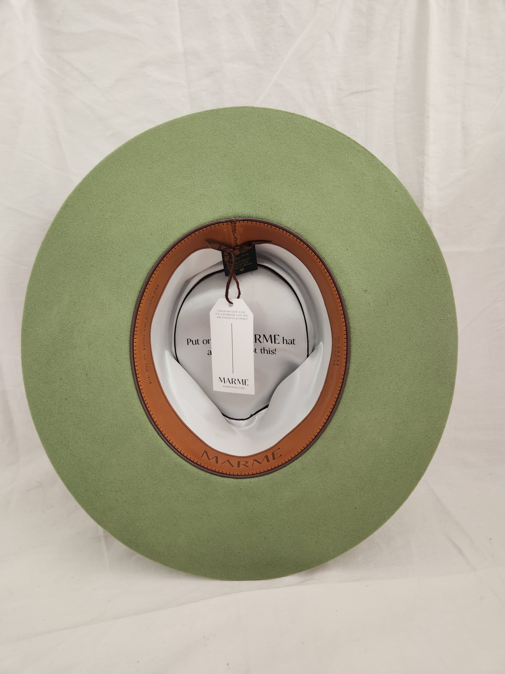 Experience luxury and style with our Stem Green Wool Hat. Made from 100% finest Bolivian wool, this hat features a green velvet ribbon, a small gold crystal pin and gold feather pendant for added elegance. The interior boasts a 100% goatskin sweatband and satin lining. With a rigid crown and brim, this hat is spot cleanable and offers a brim of 8.5cm and a crown of 11.5cm. Handcrafted with love in Mexico and designed in California. Elevate your wardrobe with this timeless piece.