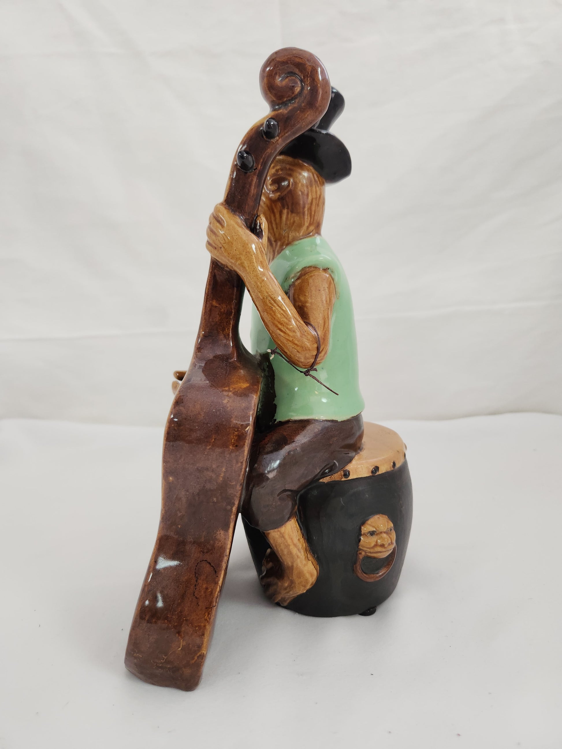 This finely crafted ceramic figure depicts a monkey playing a cello while seated on a drum table top, showcasing intricate detailing and artistic expression. Ideal for collectors and enthusiasts of unique decorative art, this piece combines whimsical charm with skilled craftsmanship, making it a distinctive addition to any display or collection.