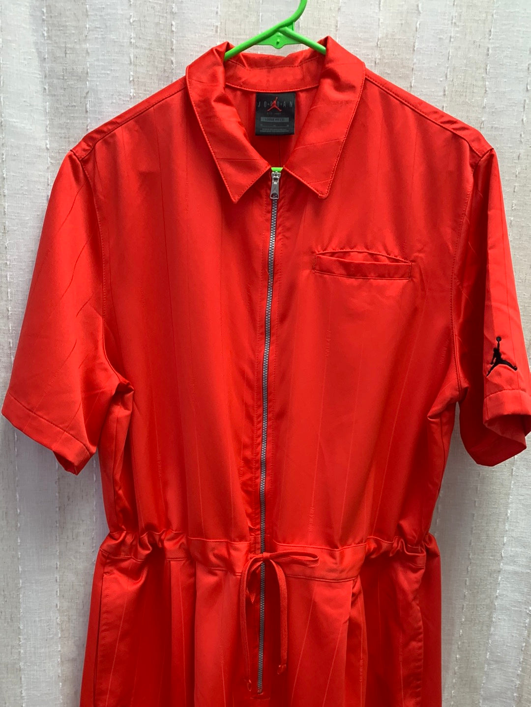 Treat yourself to a one-of-a-kind look with the NIKE AIR JORDAN red stripe Loose Wide Leg Flight Jumpsuit. This stylish jumpsuit features a wide leg, loose fit, a drawstring waist, and short sleeves. Perfect for everyday wear or nights out, you'll be turning heads wherever you go.