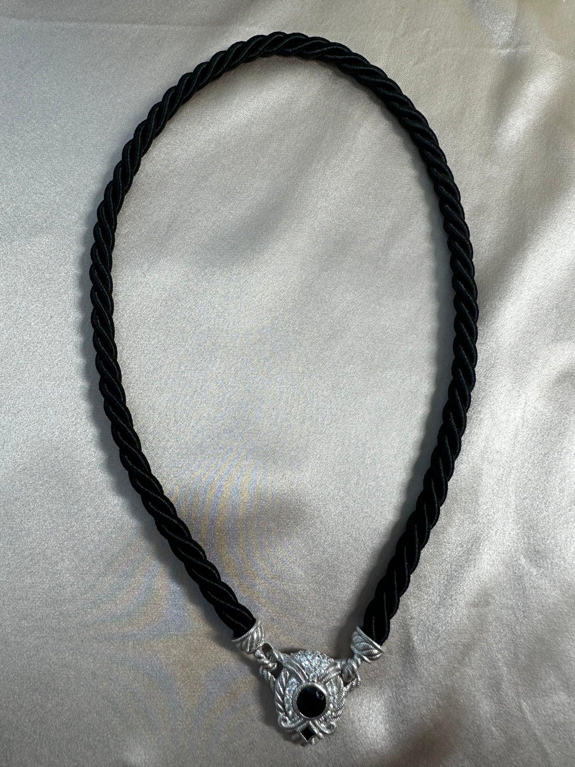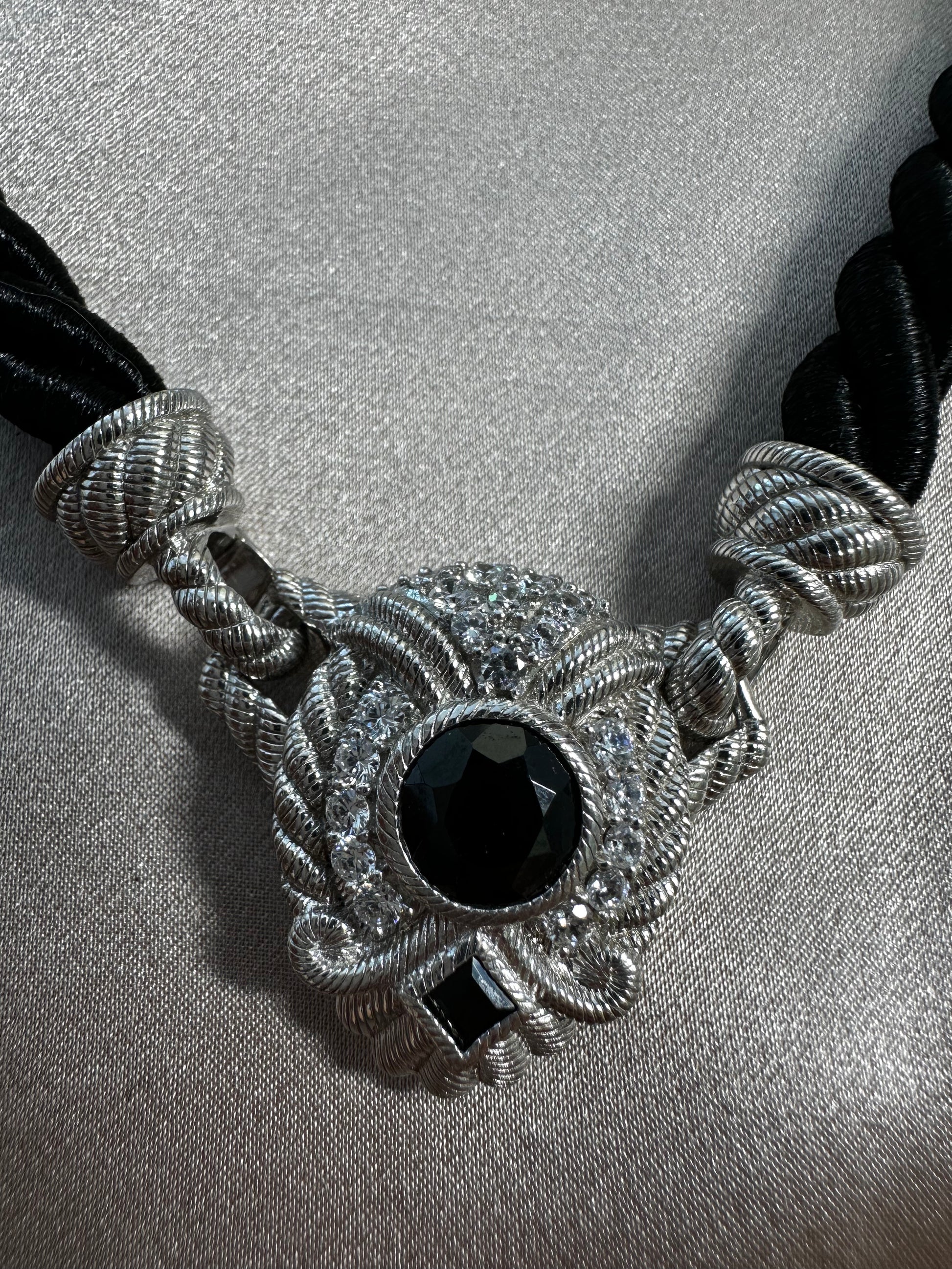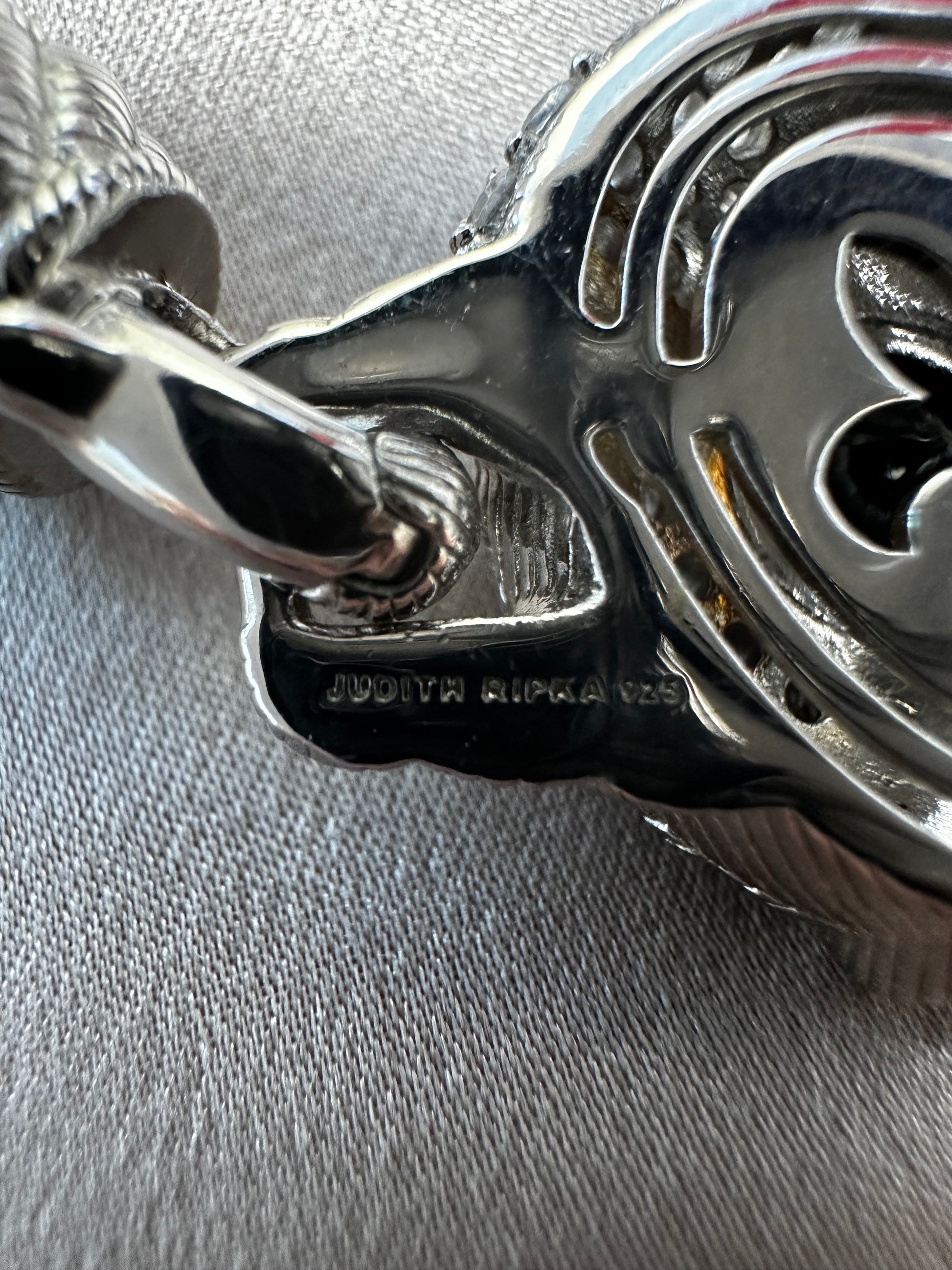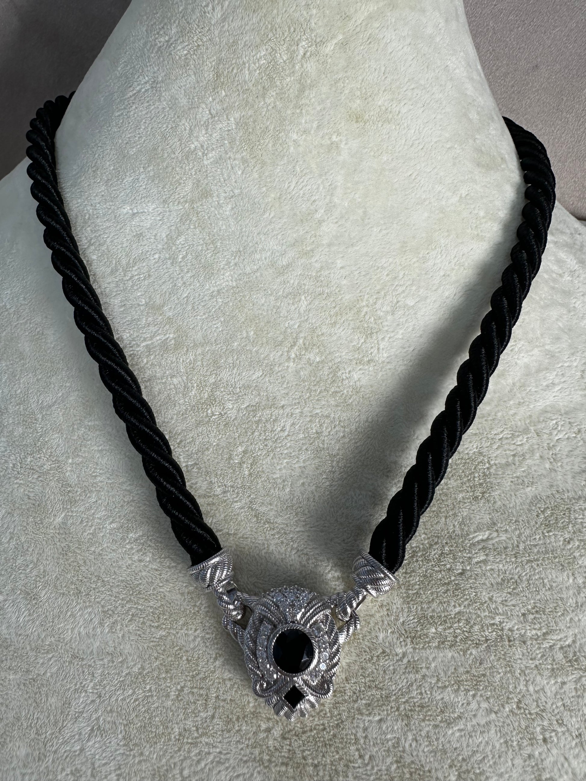 This JUDITH RIPKA necklace is expertly crafted with 925 sterling silver and features a stunning cubic zirconia and onyx pendant. The 20" black cord adds a touch of elegance to this timeless piece. Elevate your style with this beautiful necklace that is both versatile and sophisticated.