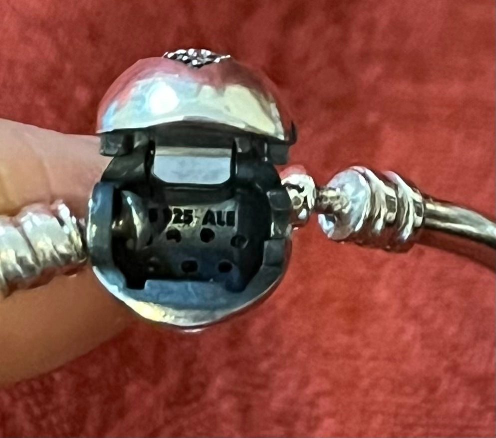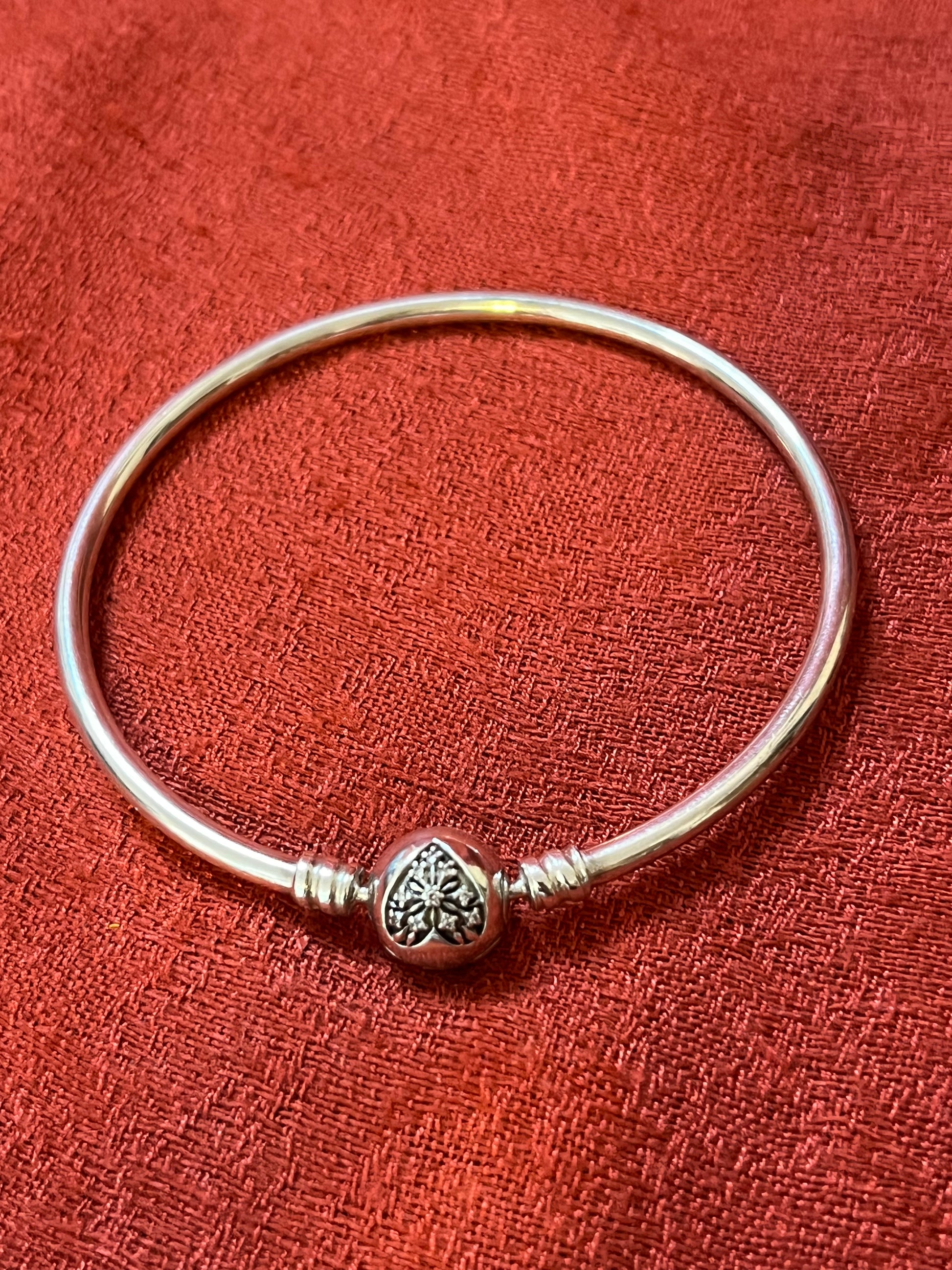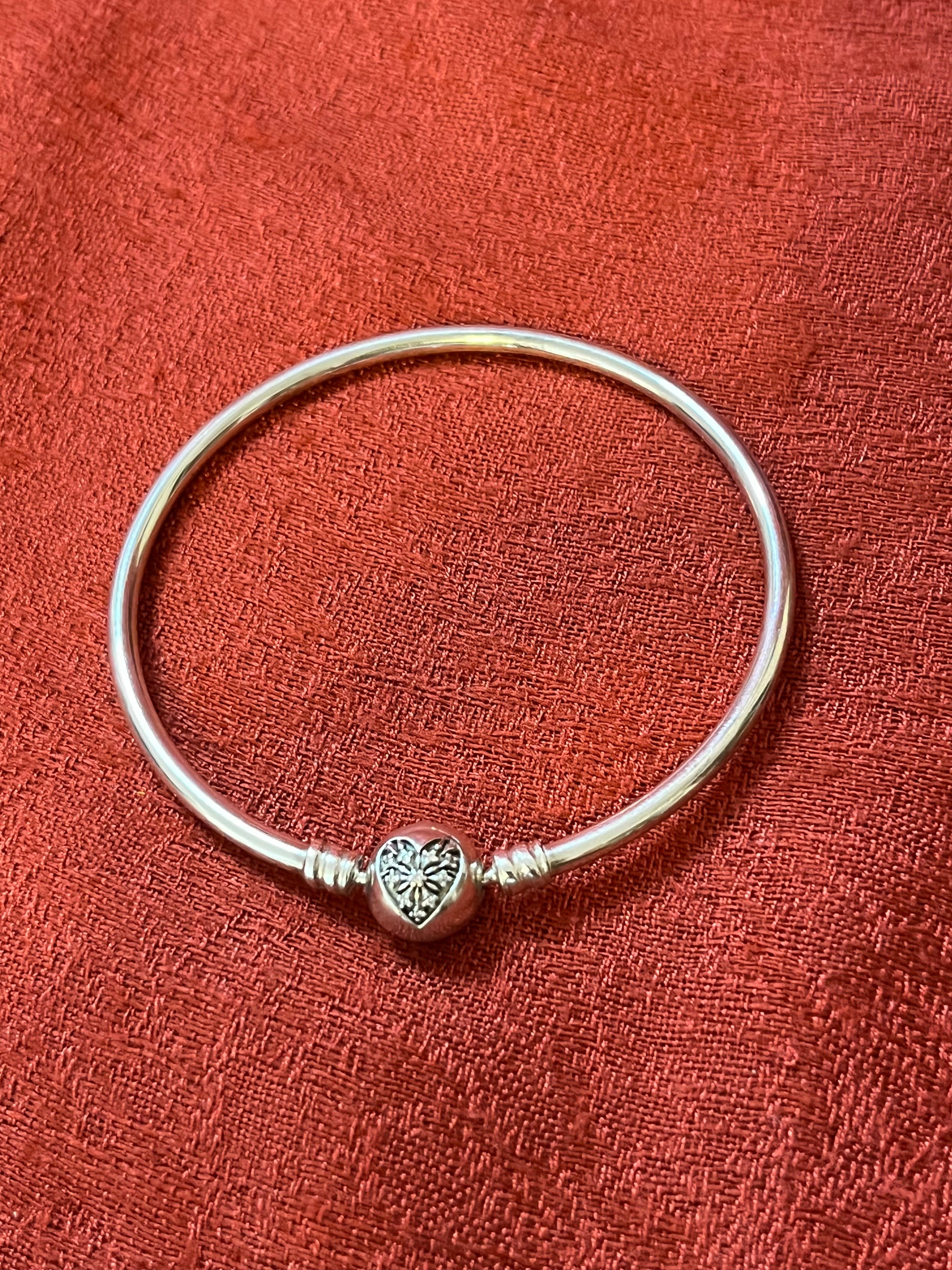 Add to your Pandora collection this limited edition sterling bangle, which features a cz heart on the bangle closure. Bangle is in excellent condition and has "My heart Melts for You" engraved. <3 Sized for up to 7 inch wrist.