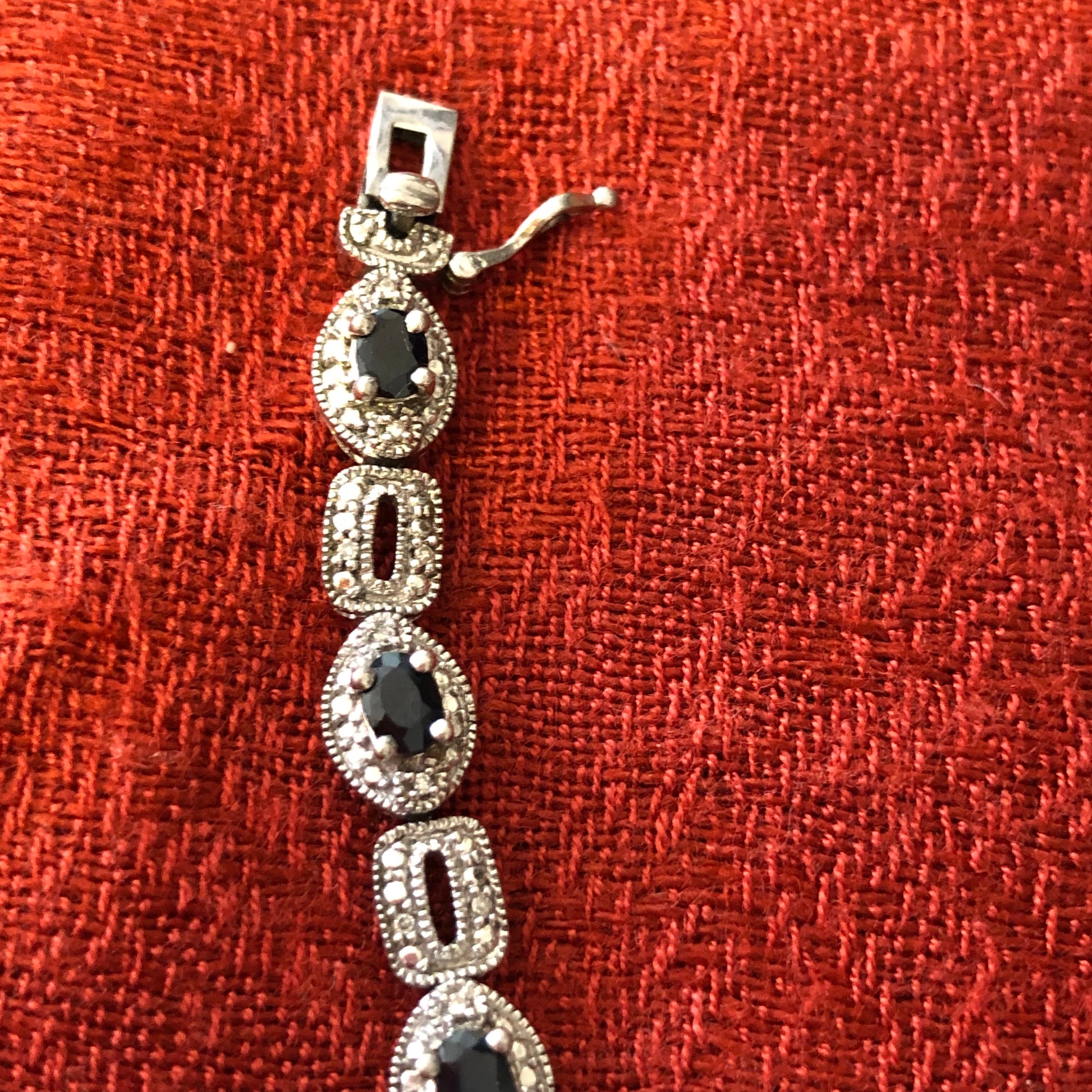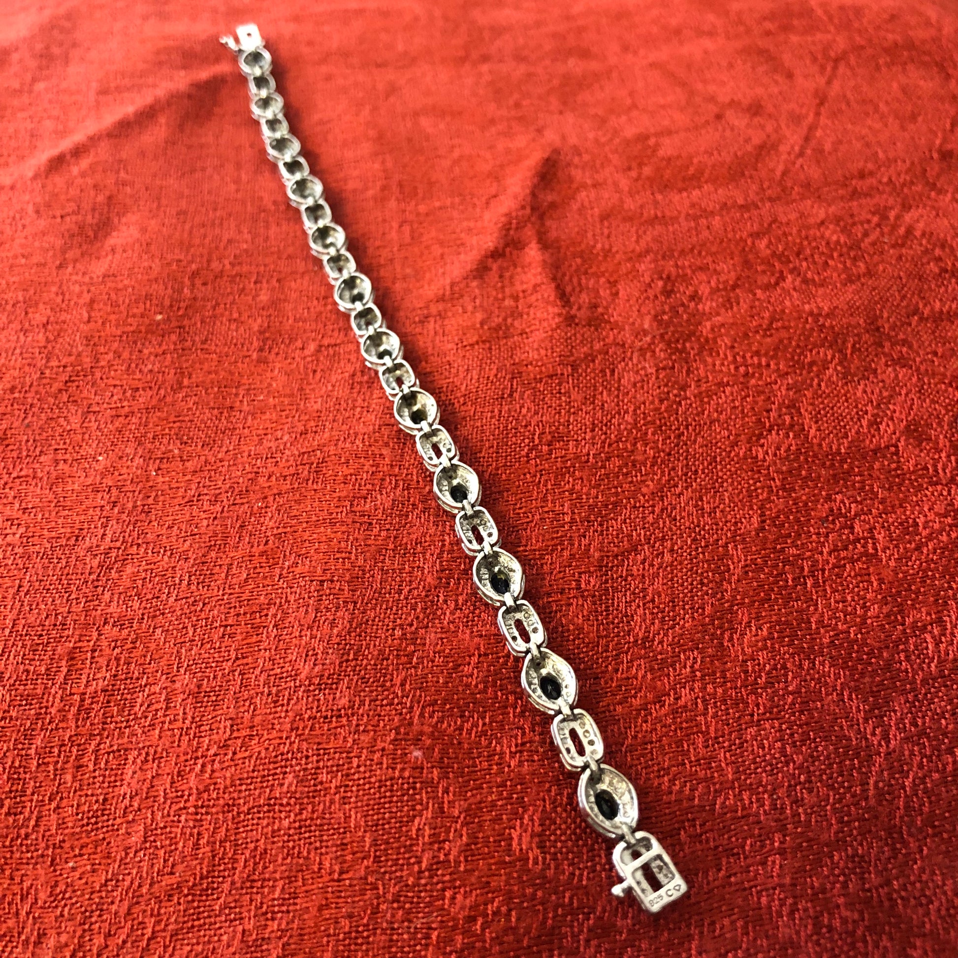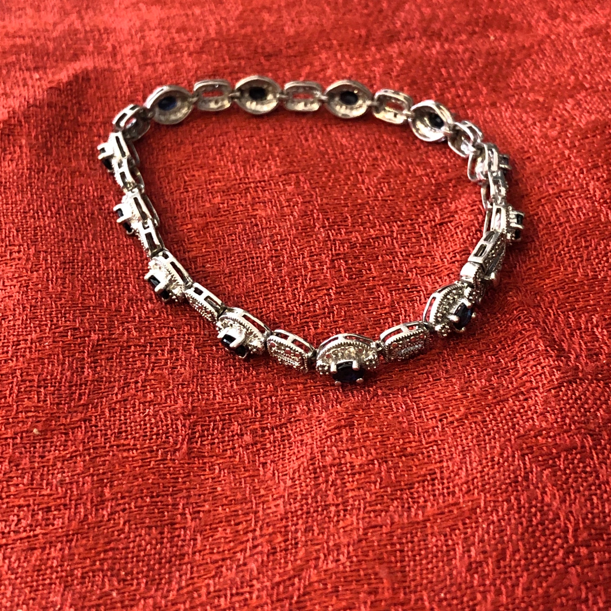 Beautiful tennis style bracelet with blue & clear cubic zirconia accents. Bracelet has a safety closure and measures 7 inches long, and is in very good condition.