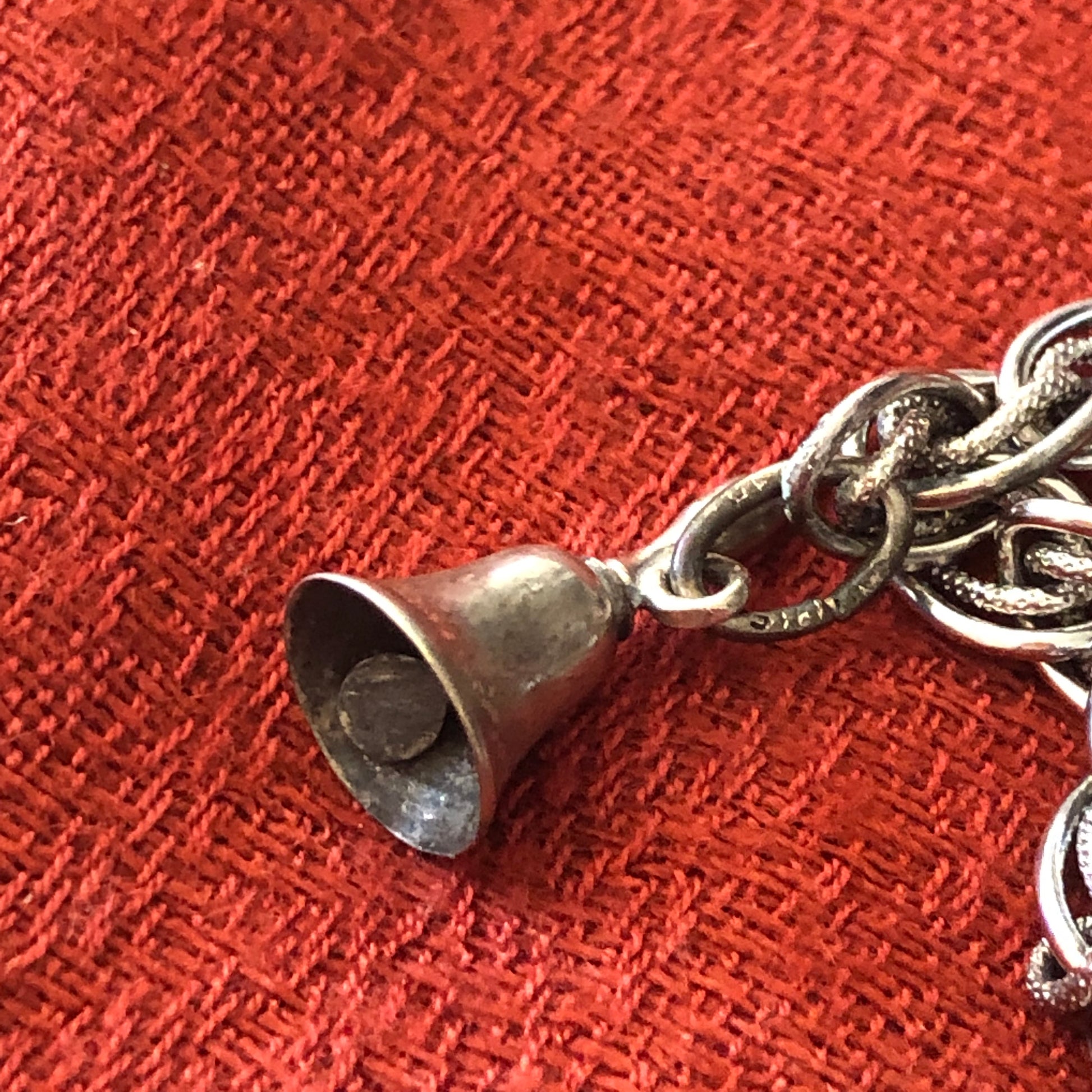 Vintage charm bracelet with four charms, two of which are religiously affiliated. Also a Beau Sterling Mechanical Well charm and silver bell are included. Bracelet measures 7 inches and has patina commensurate with age.