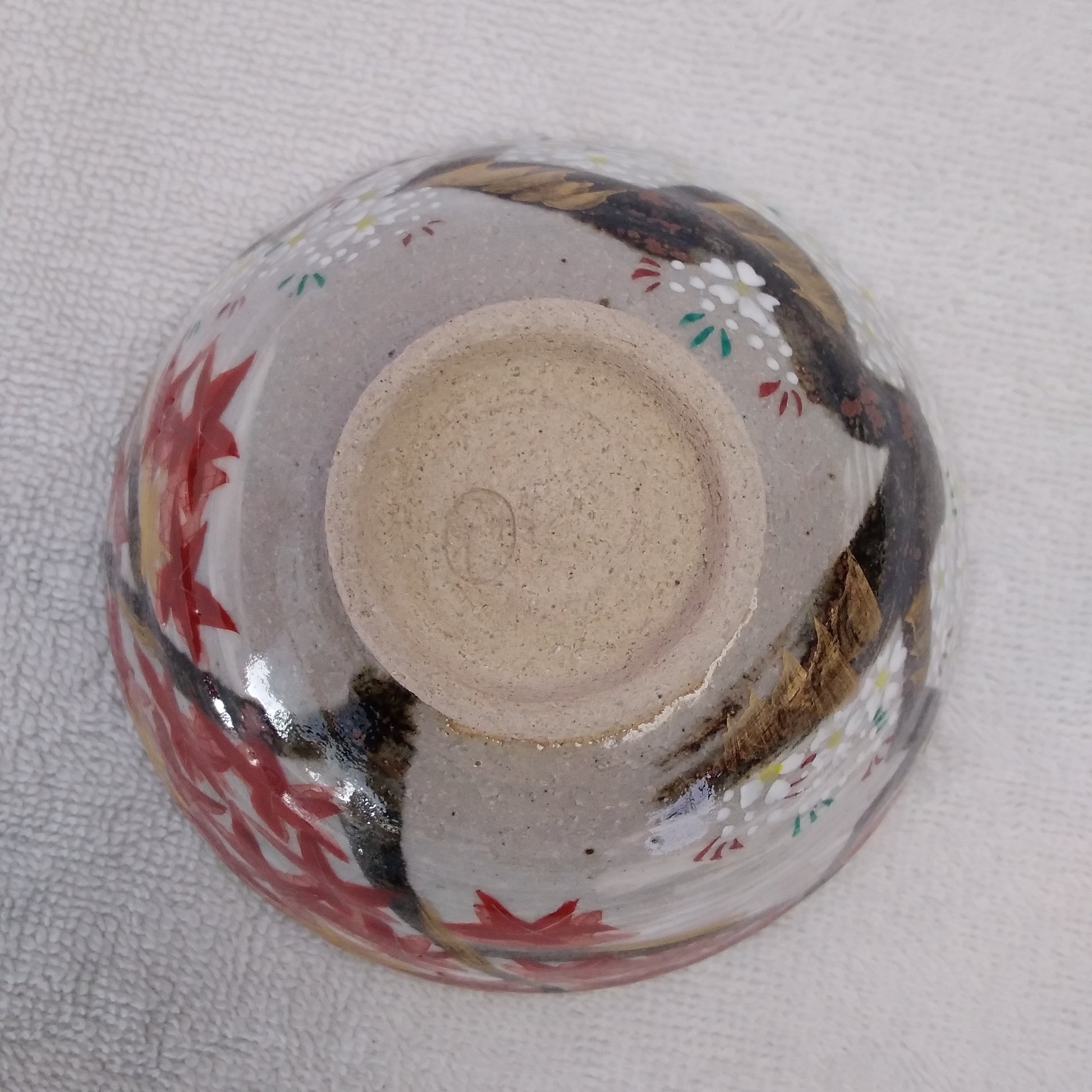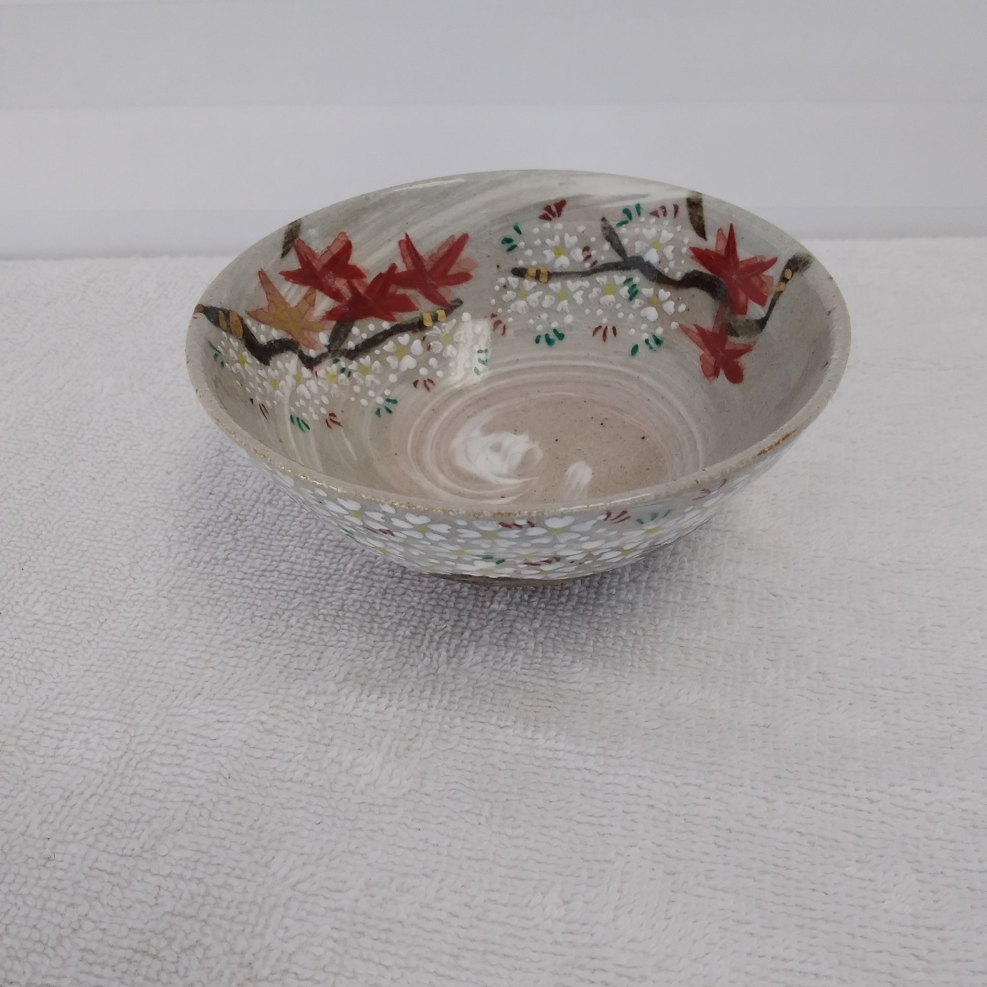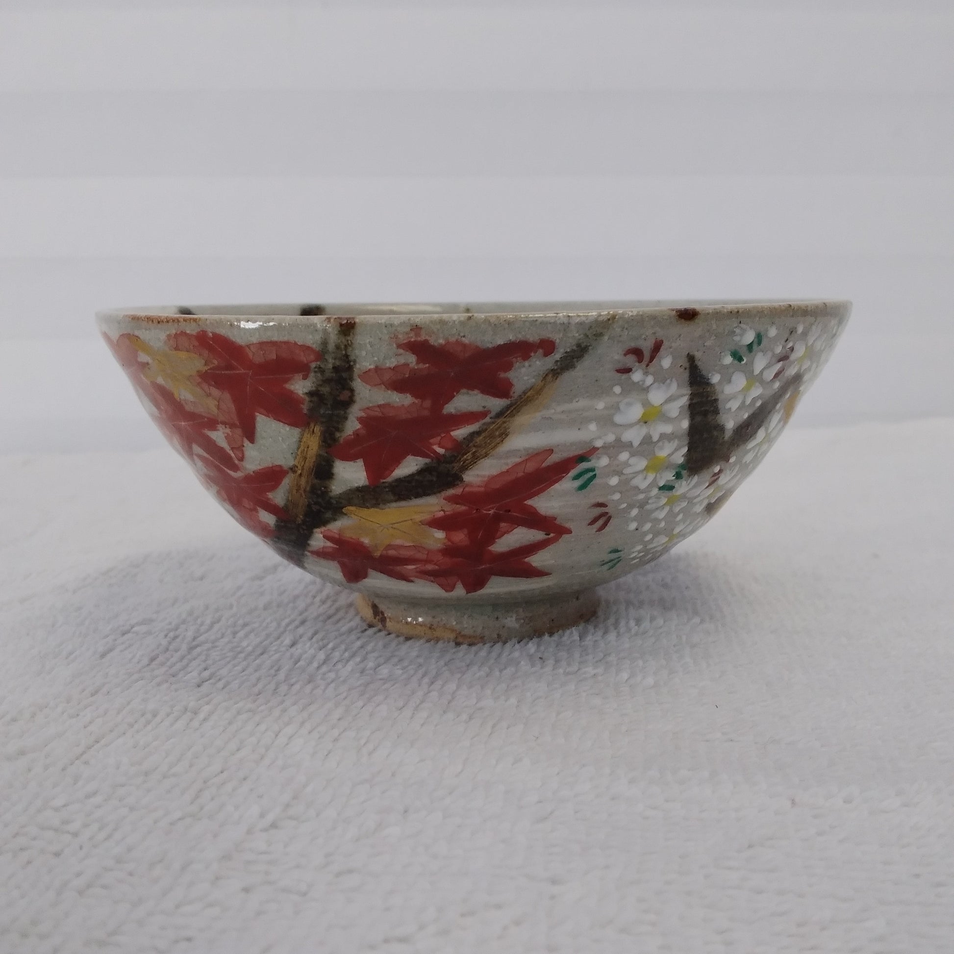 Hand-Painted Japanese Cherry Blossom and Maple Leaf Rice Bowl with Pottery Stamp on Bottom