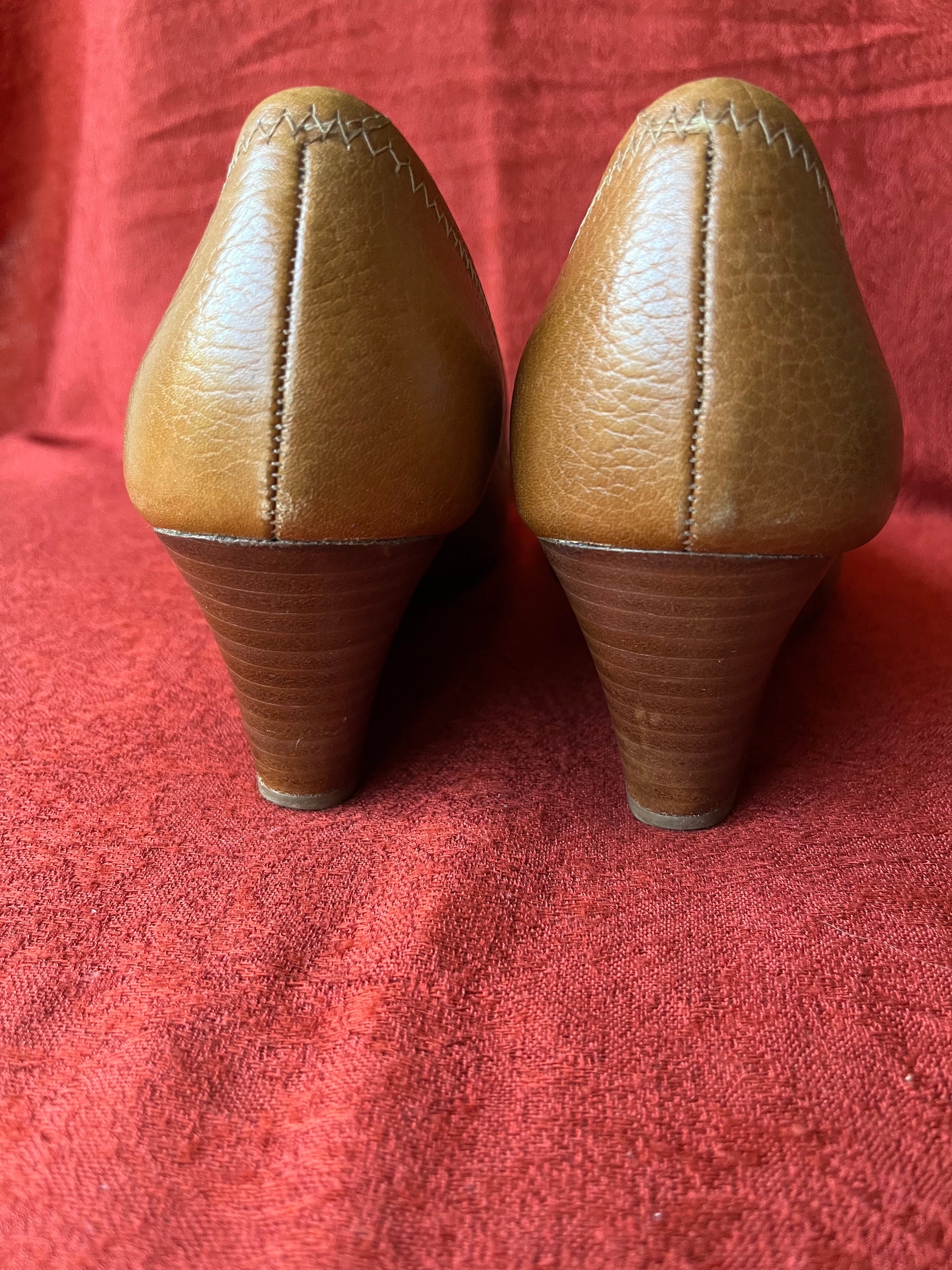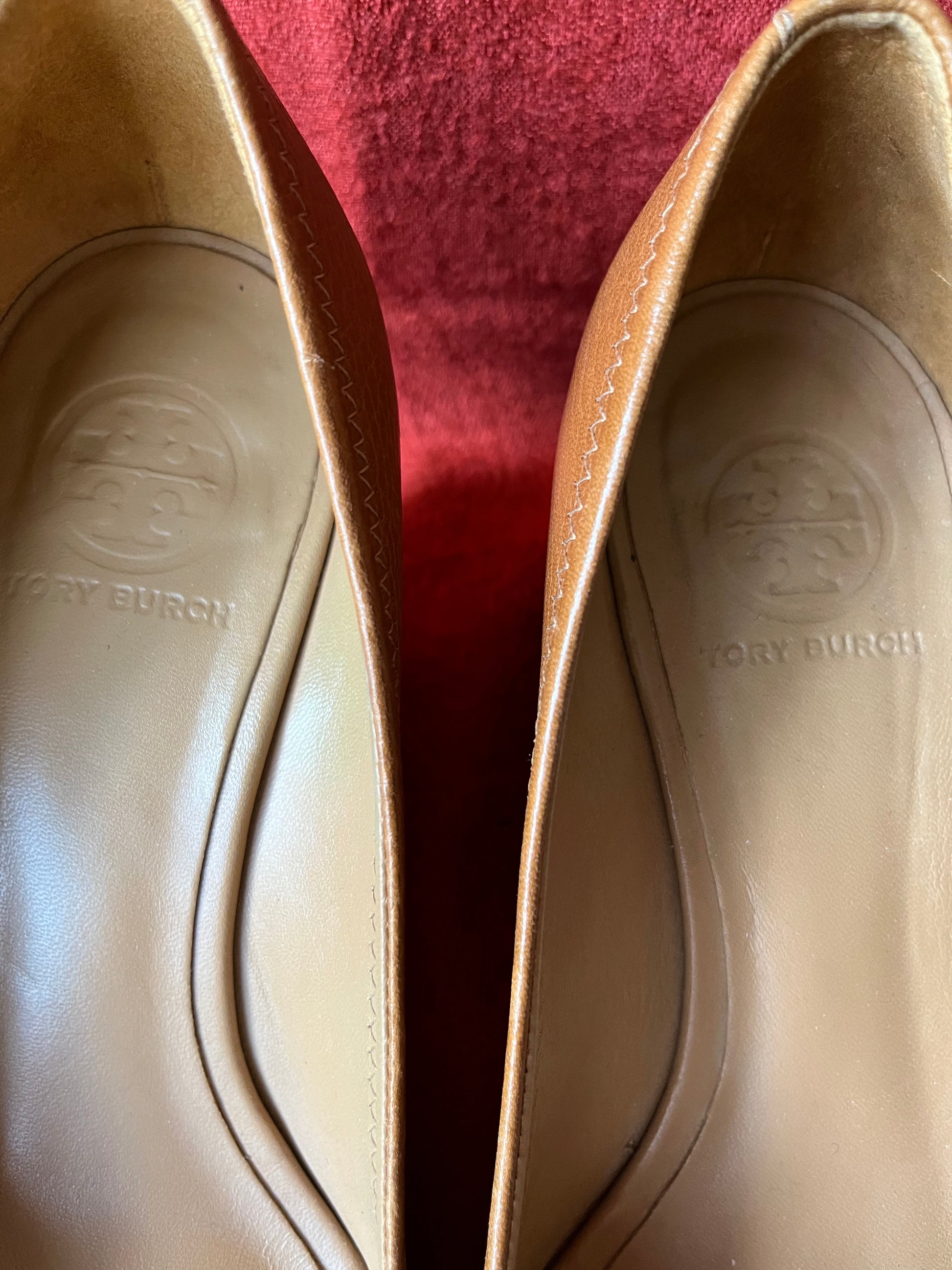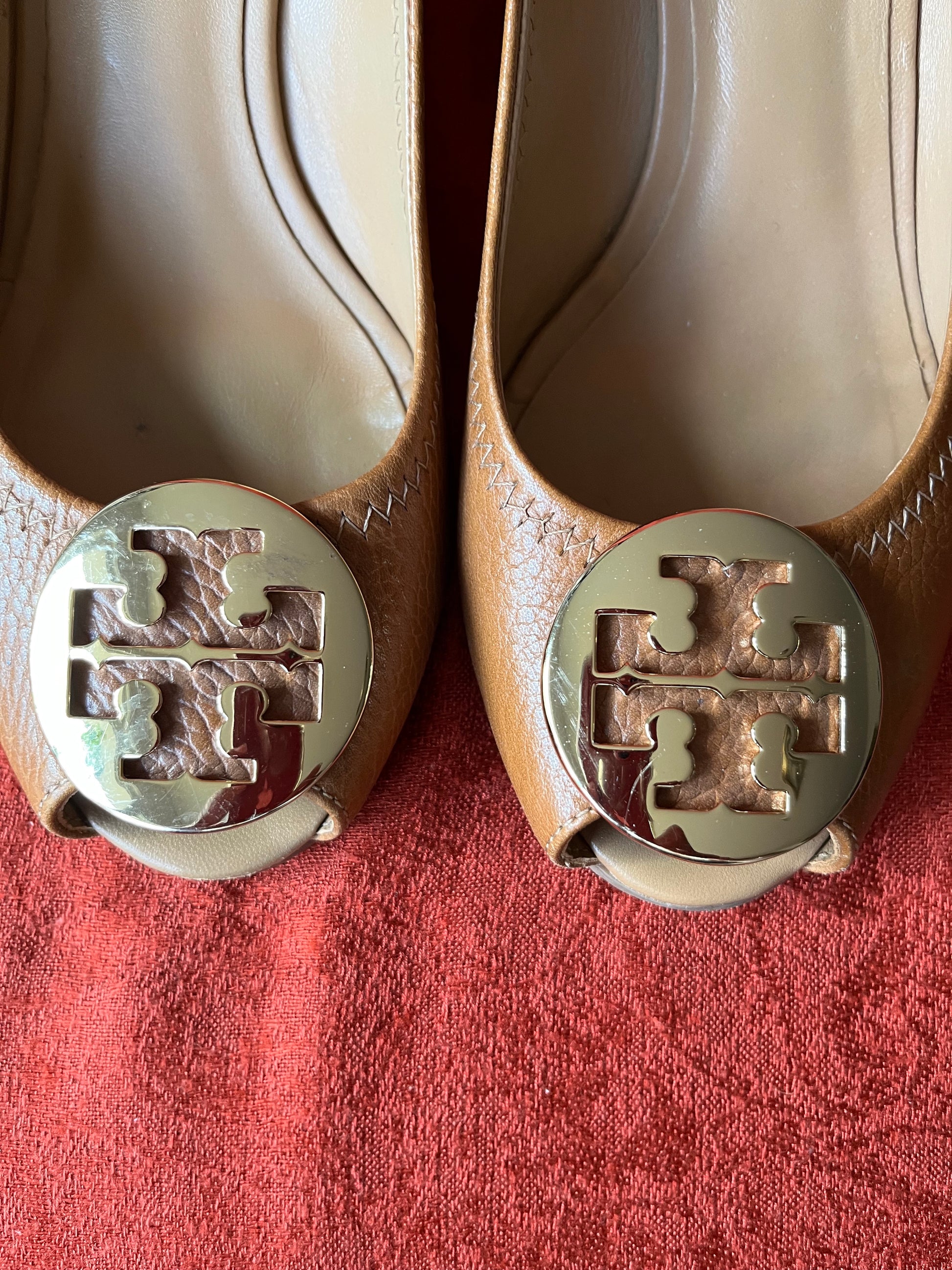 Gently used Tory Burch brown leather "Julianne" peep toe wedge heels in size 8M. Shoes are in good condition with minor wear (see pics).