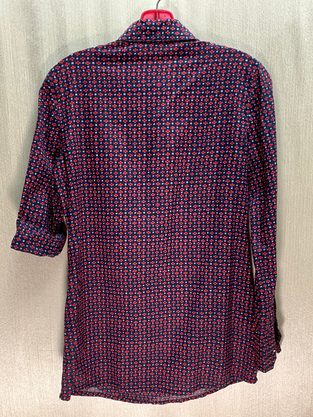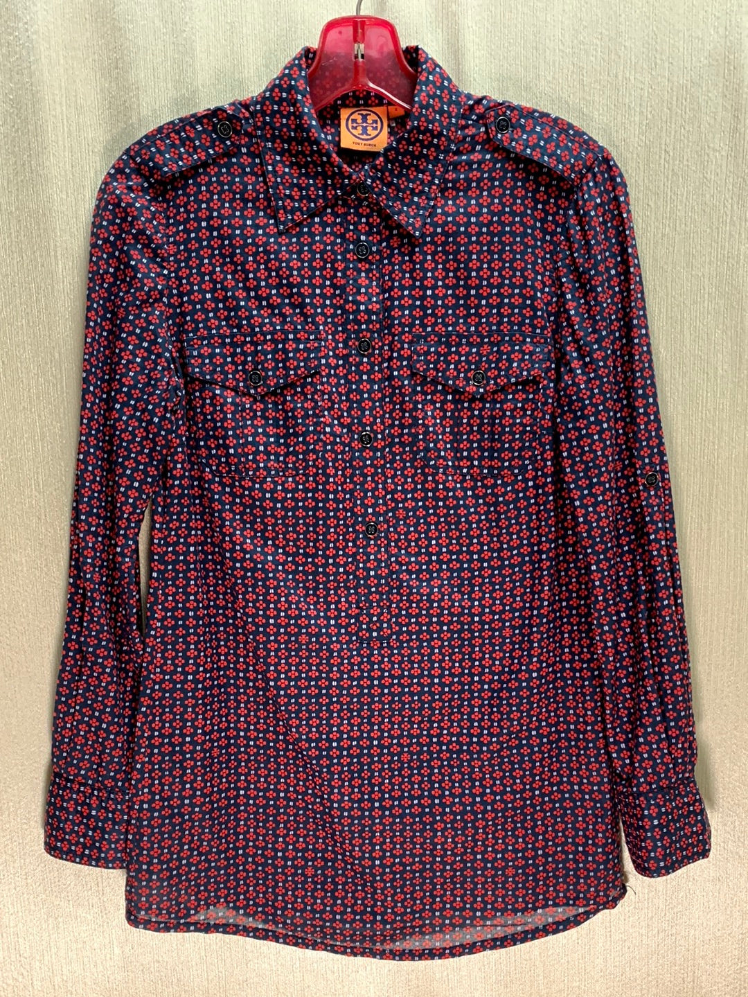 This TORY BURCH navy red print Cotton Roll Tab Long Sleeve Blouse is designed with lightweight fabric and long sleeves. The roll tab design allows for a customizable look, perfect for any occasion. Enjoy the comfort and breathability of this blouse.