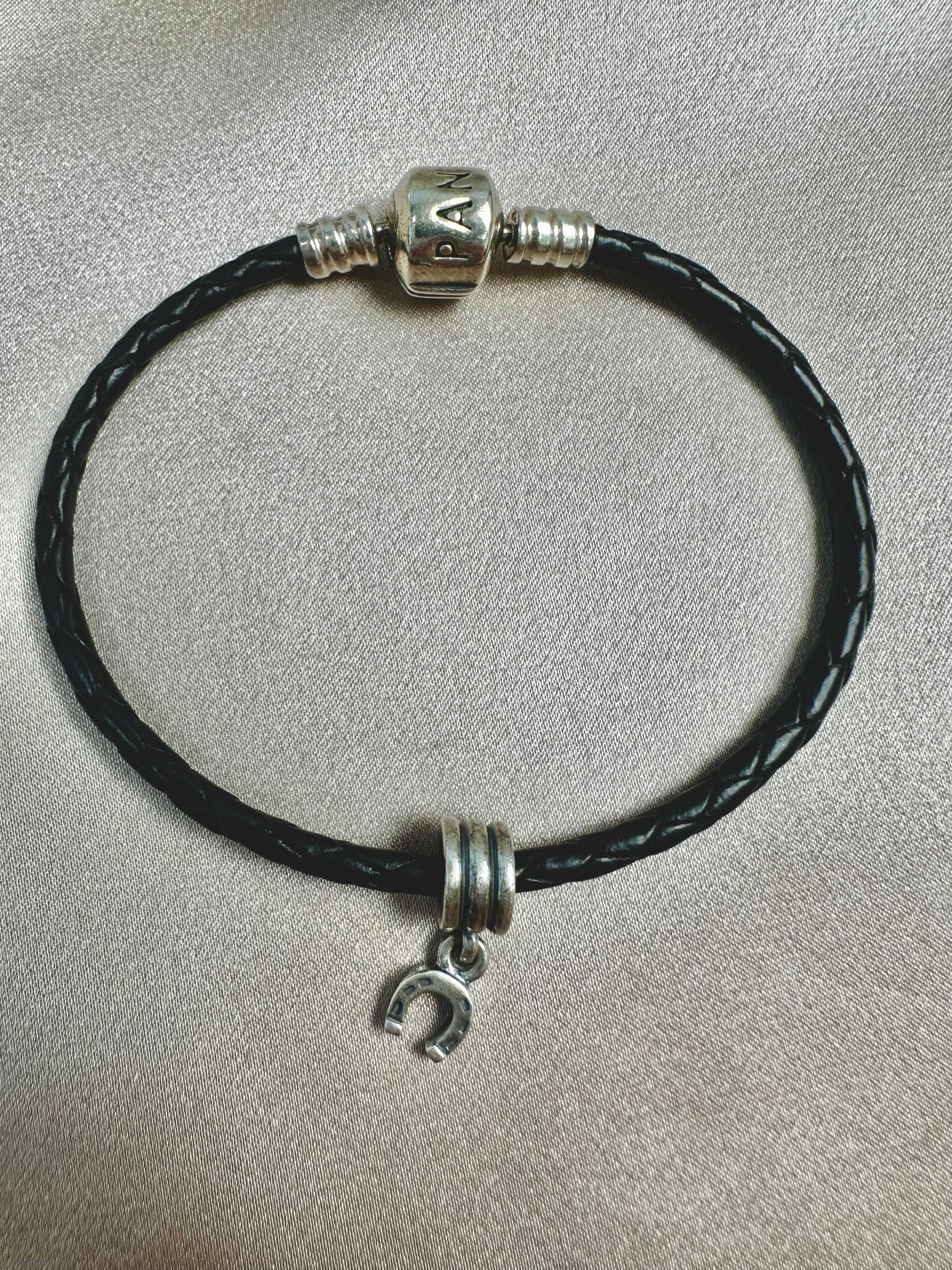 Become a symbol of good luck and fortune with the PANDORA Black Braided Leather Charm Bracelet. Made of genuine 925 ALE silver and featuring a horseshoe charm, this bracelet adds a touch of elegance and positivity to any outfit. Its braided leather design adds durability and style, making it the perfect accessory for daily wear.