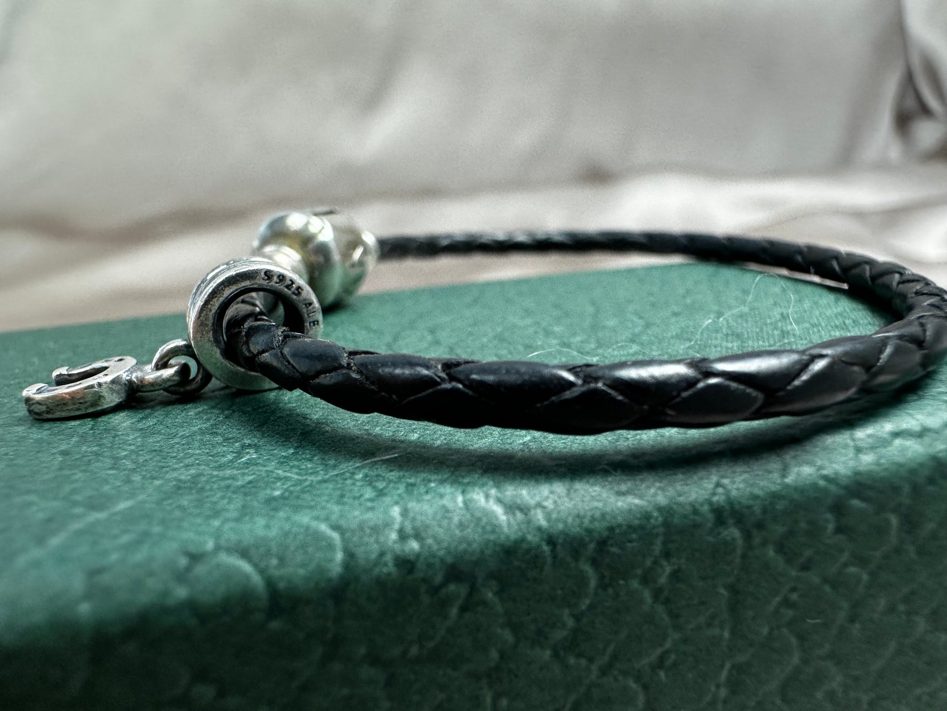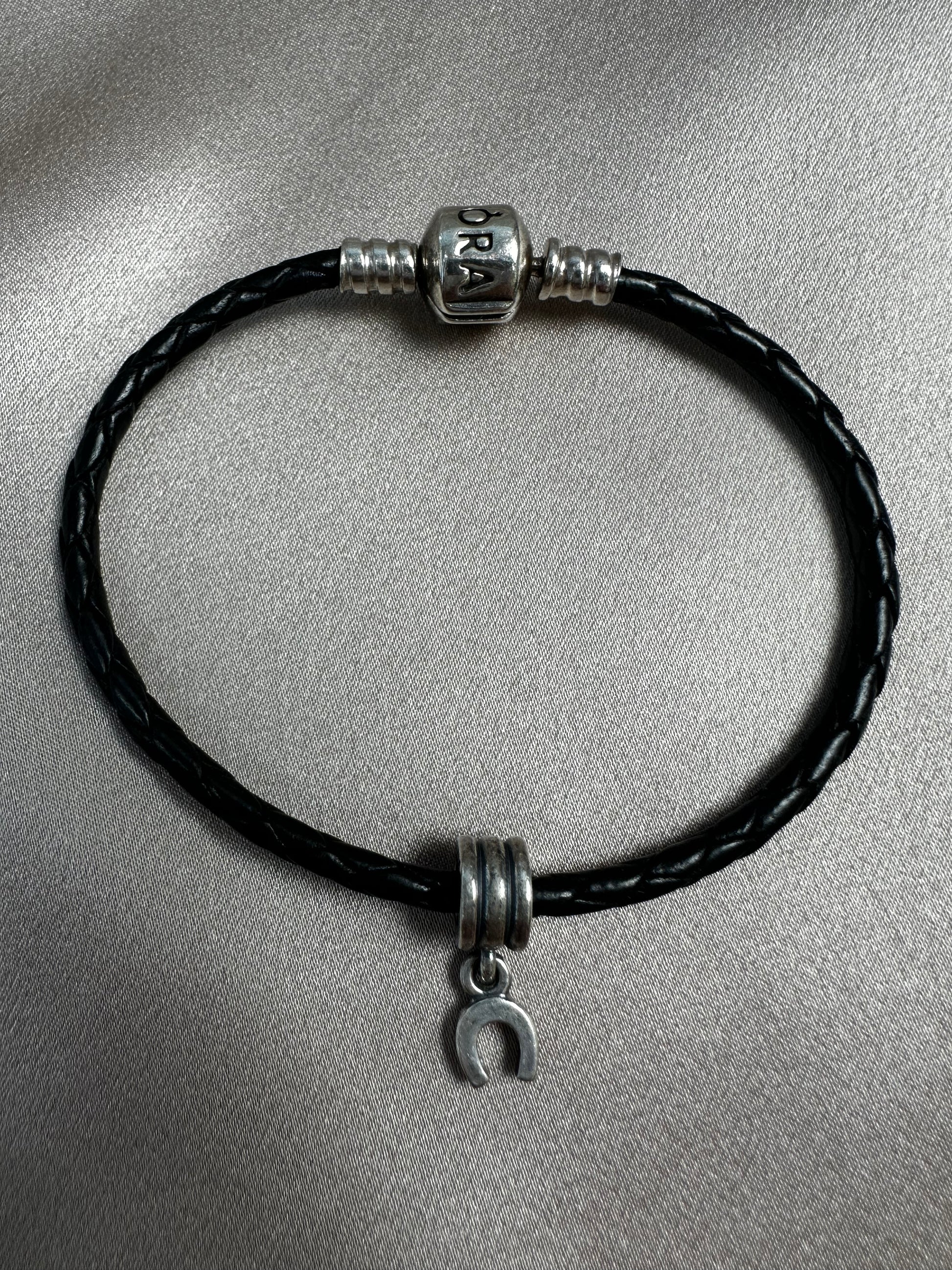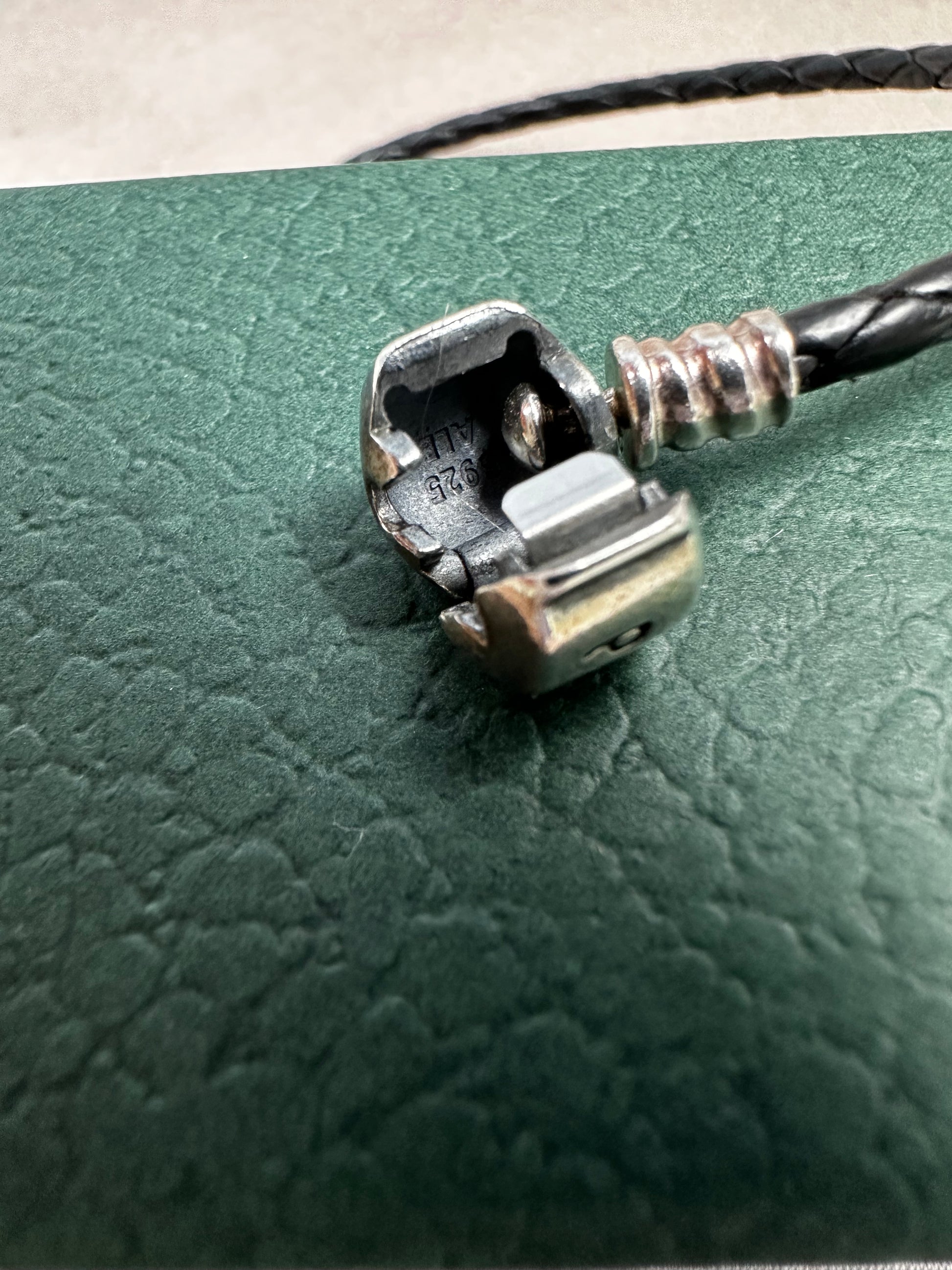 PANDORA Black Braided Leather 925 ALE Silver Clasp Horseshoe Charm Bracelet - 6.75"