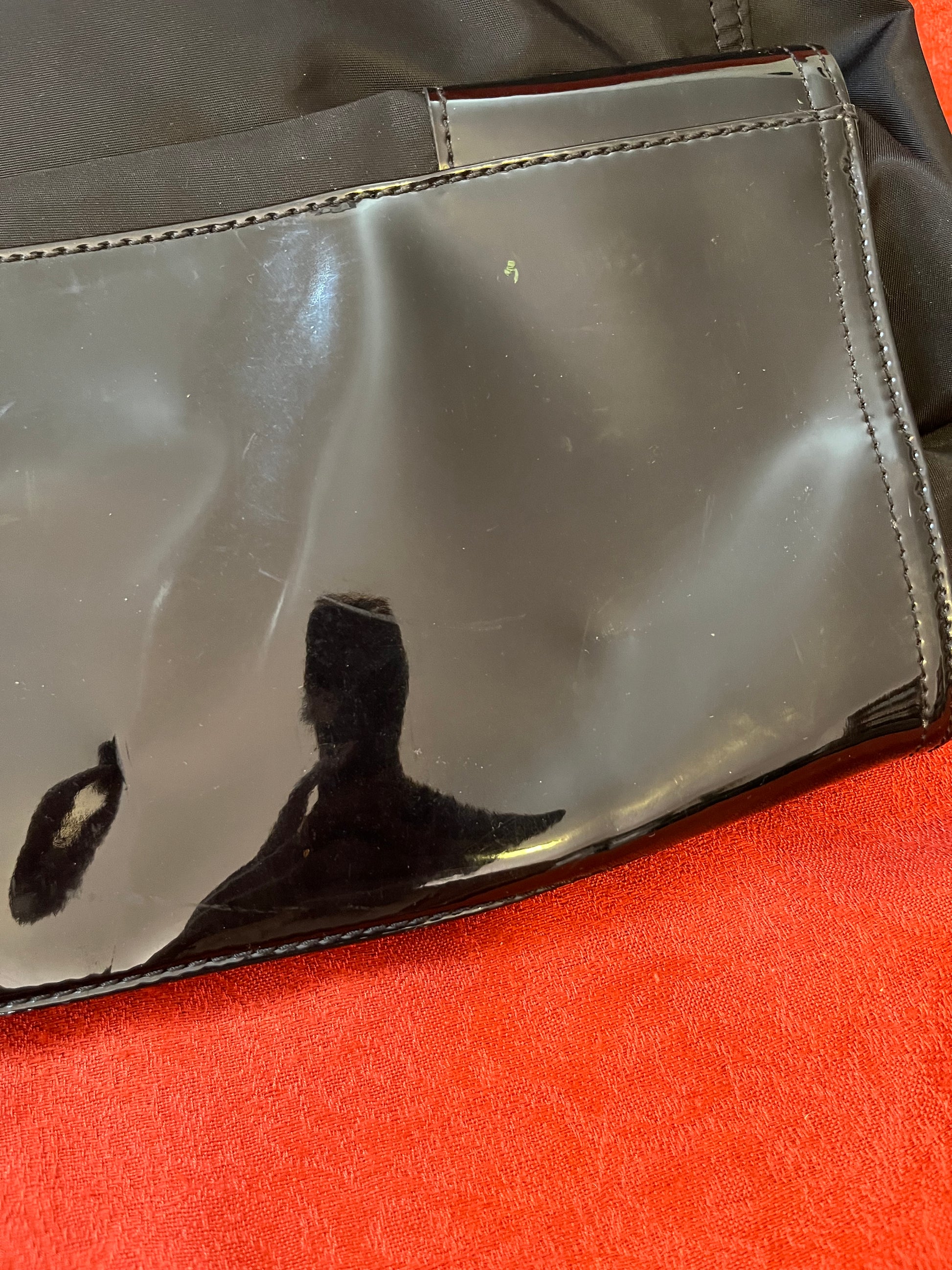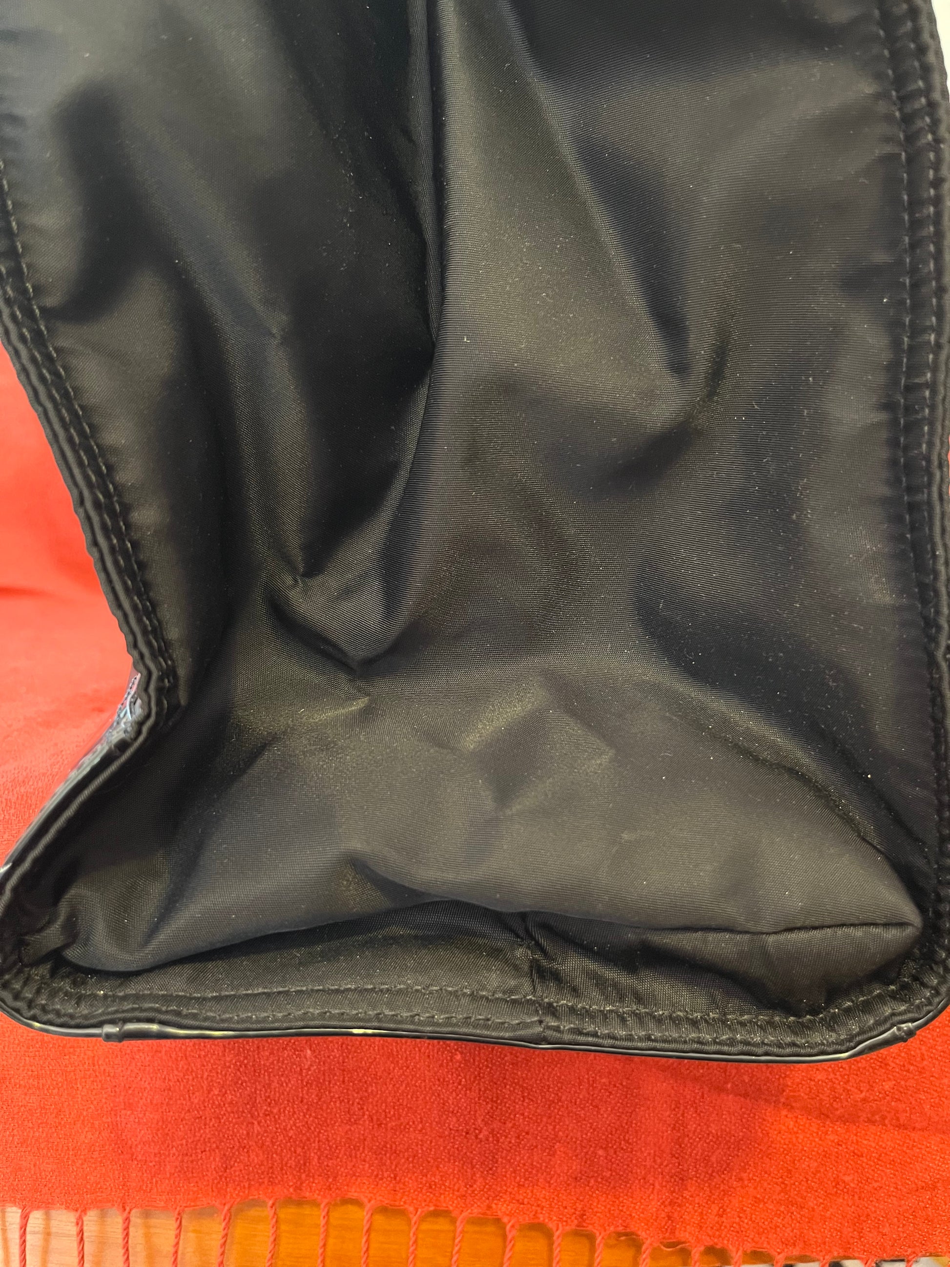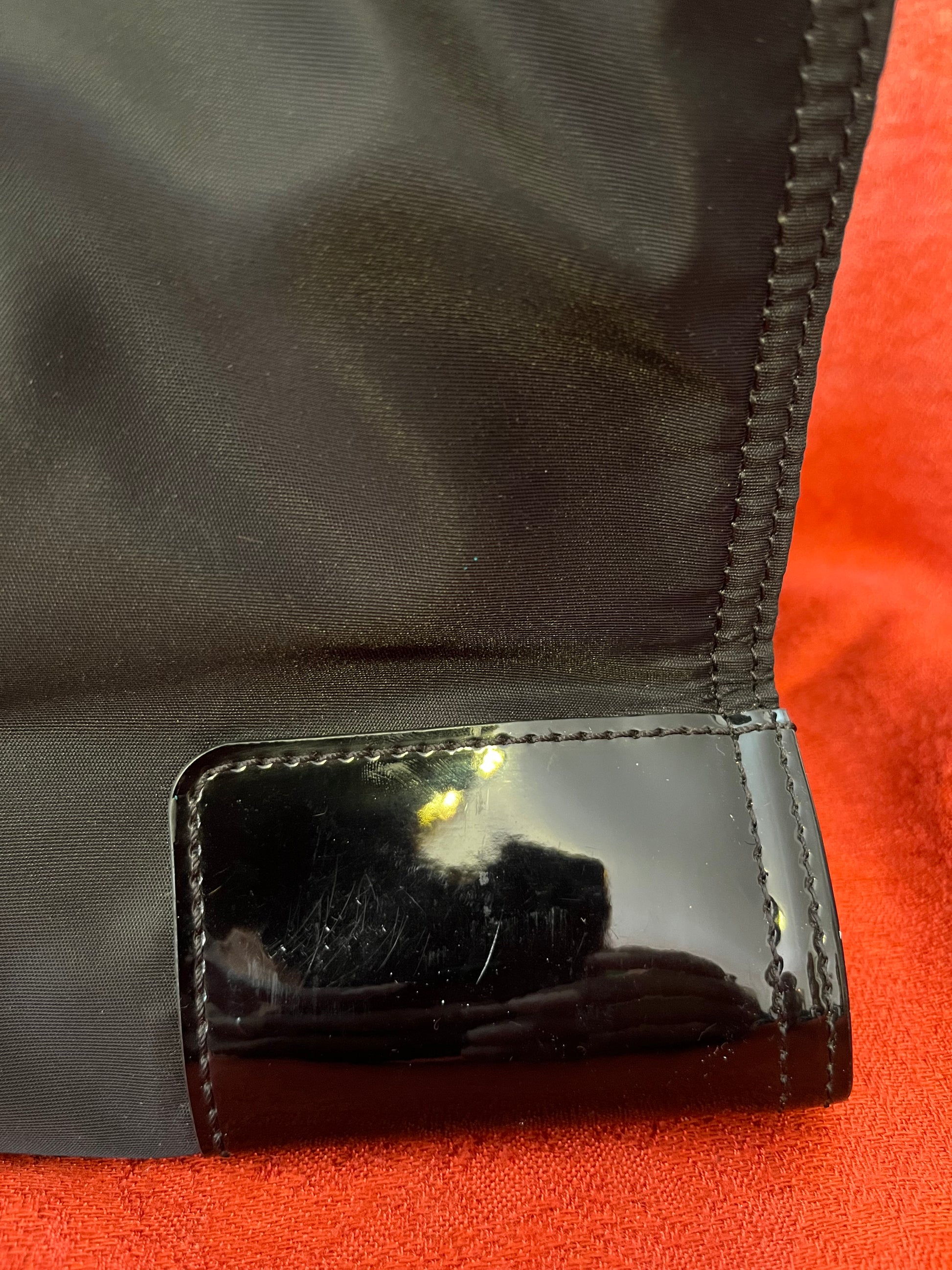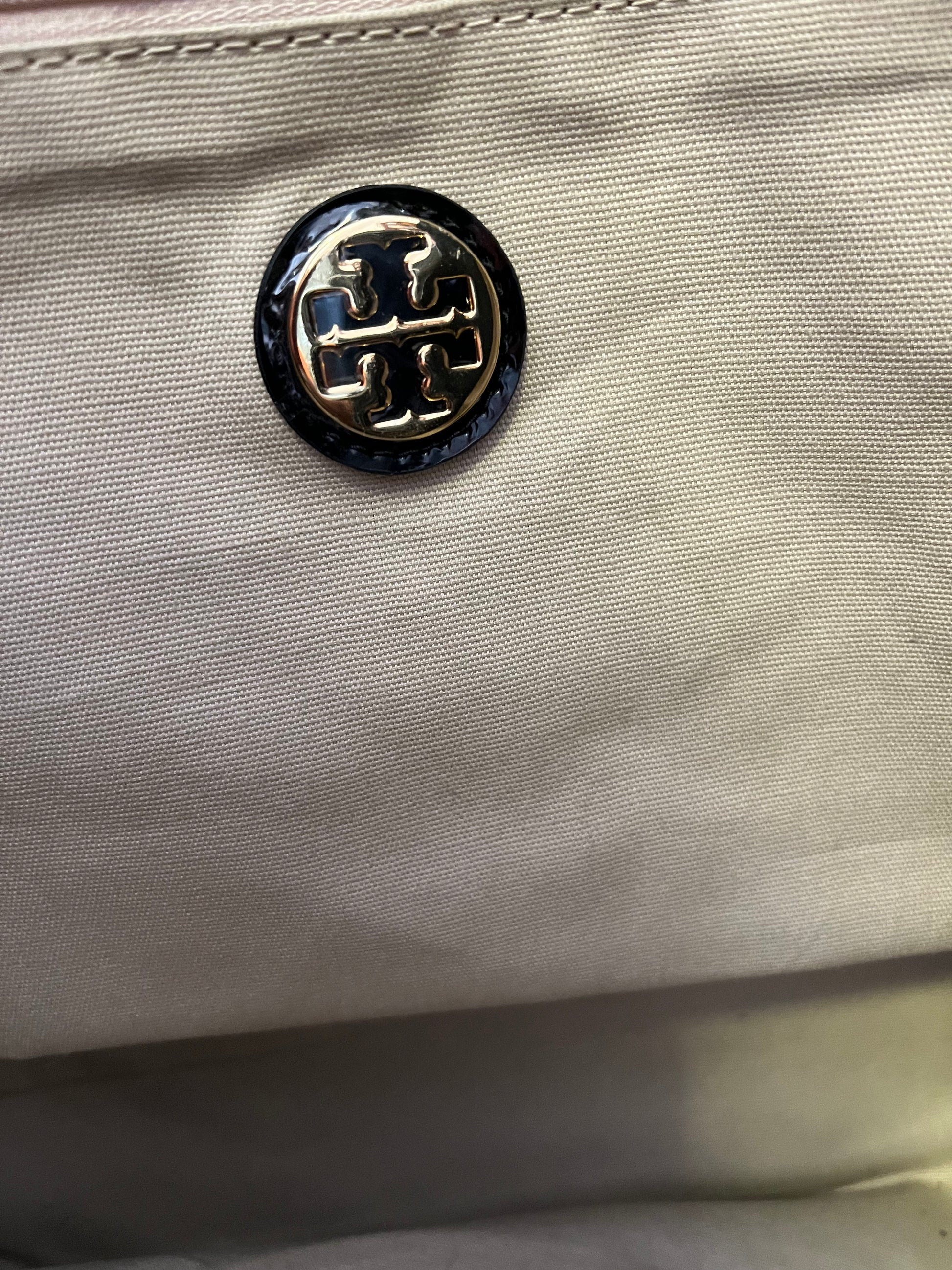 Stylish large black patent leather and nylon Tory Burch. Tote is lined with beige canvas and patent leather trim. One large zip pocket with Tory Burch emblem and two smaller pockets (see pics). Tote is in better than good condition with very minor wear (see pics). Tote measures 16.5 x 13 (with handle measures 20 inch) x 6.