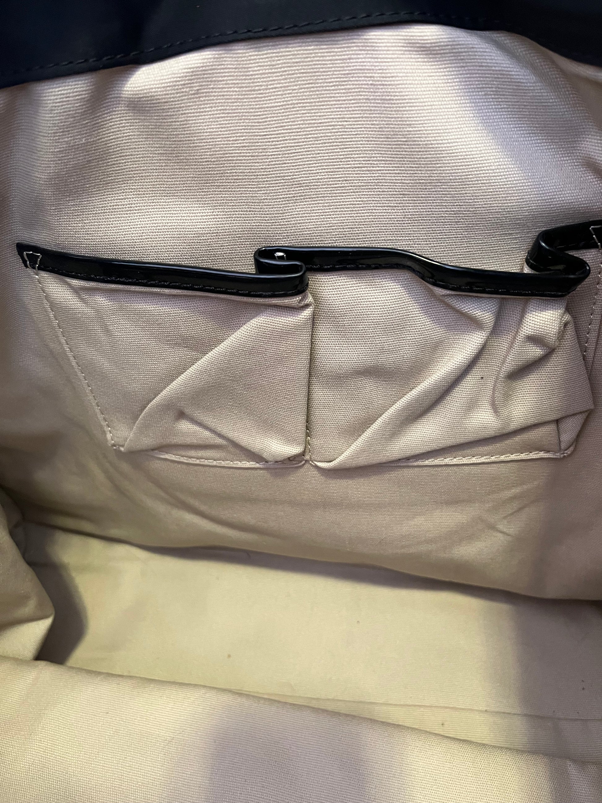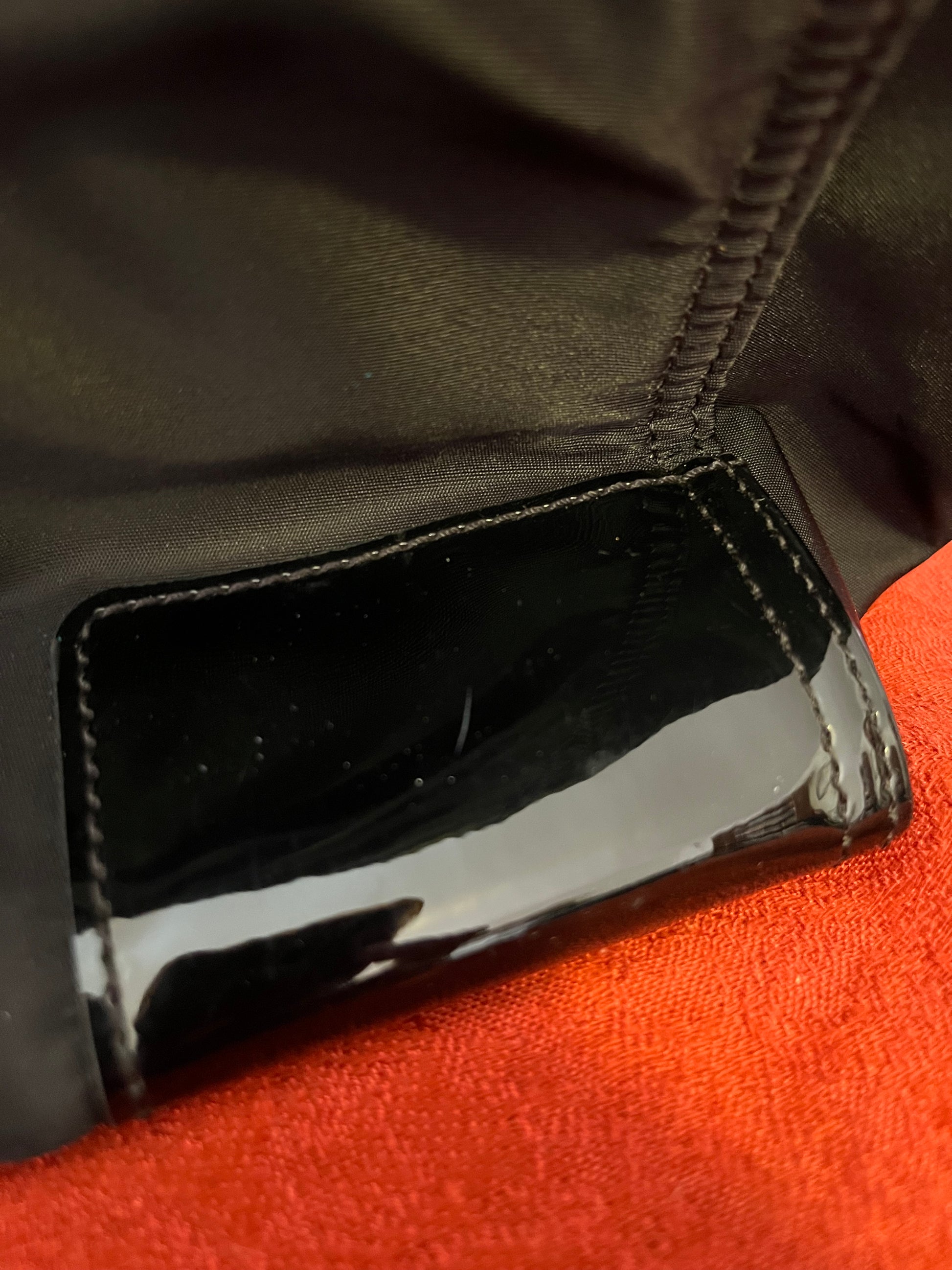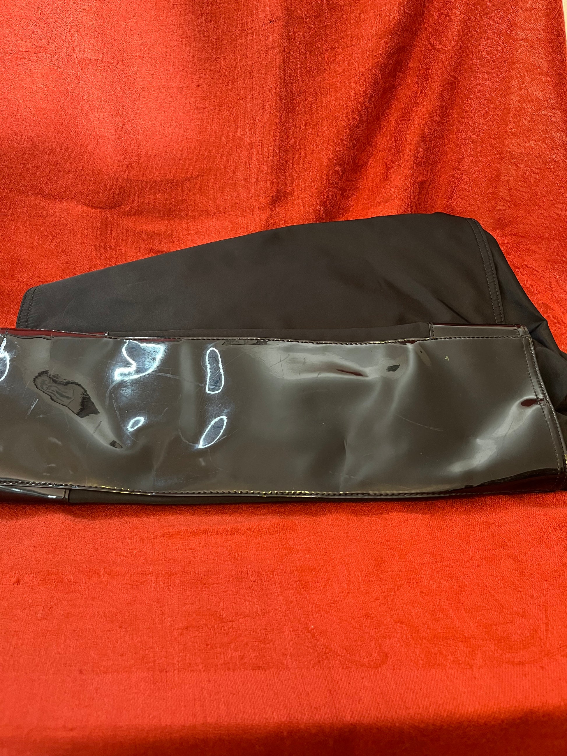 Stylish large black patent leather and nylon Tory Burch. Tote is lined with beige canvas and patent leather trim. One large zip pocket with Tory Burch emblem and two smaller pockets (see pics). Tote is in better than good condition with very minor wear (see pics). Tote measures 16.5 x 13 (with handle measures 20 inch) x 6.