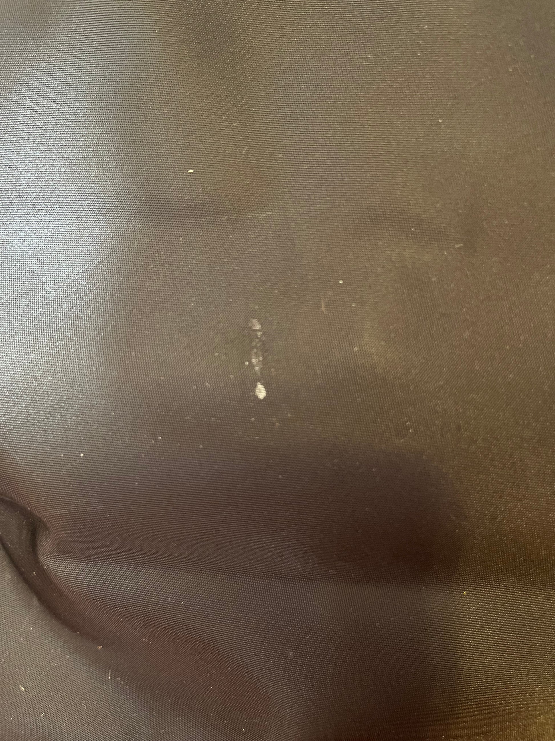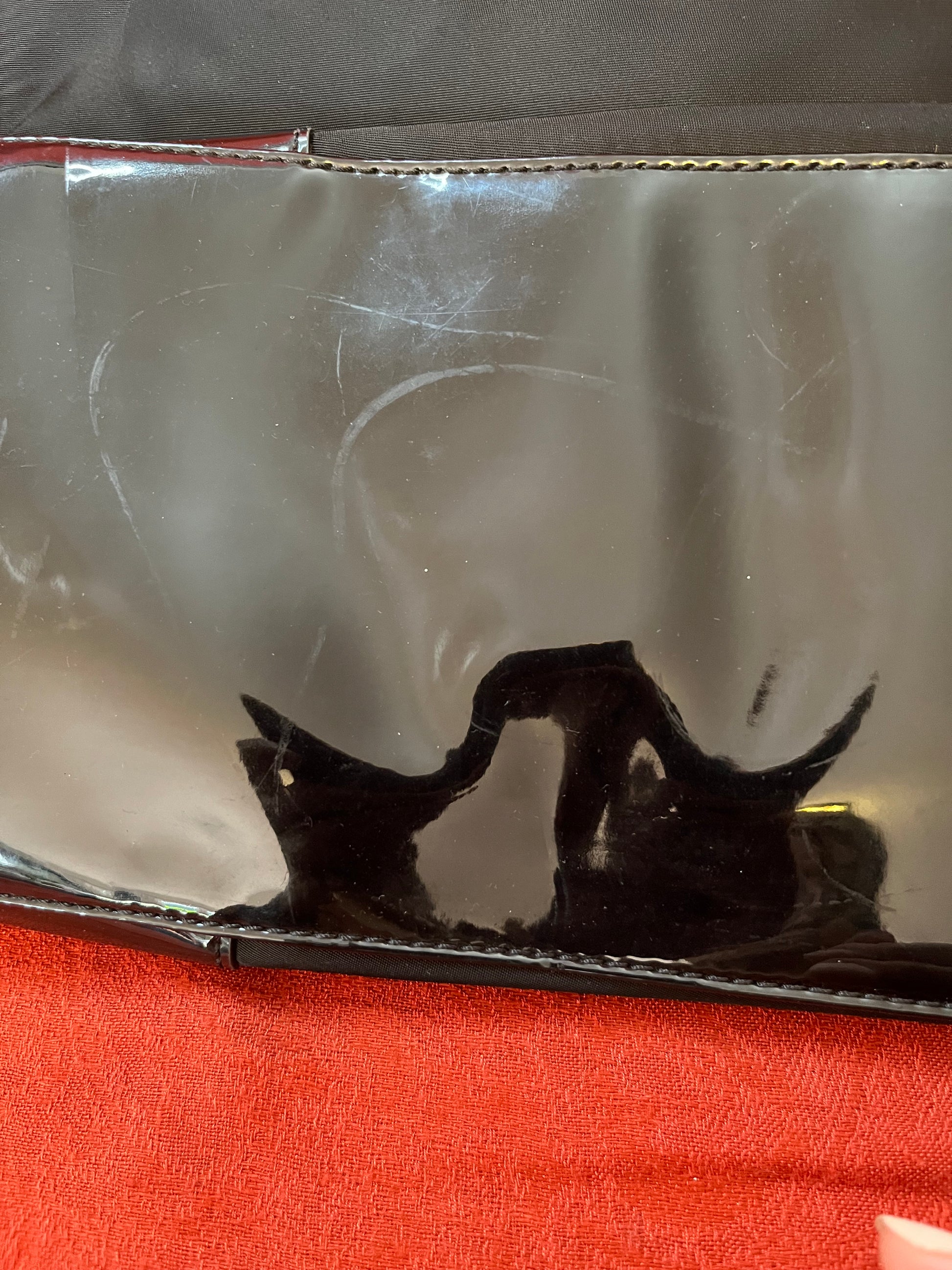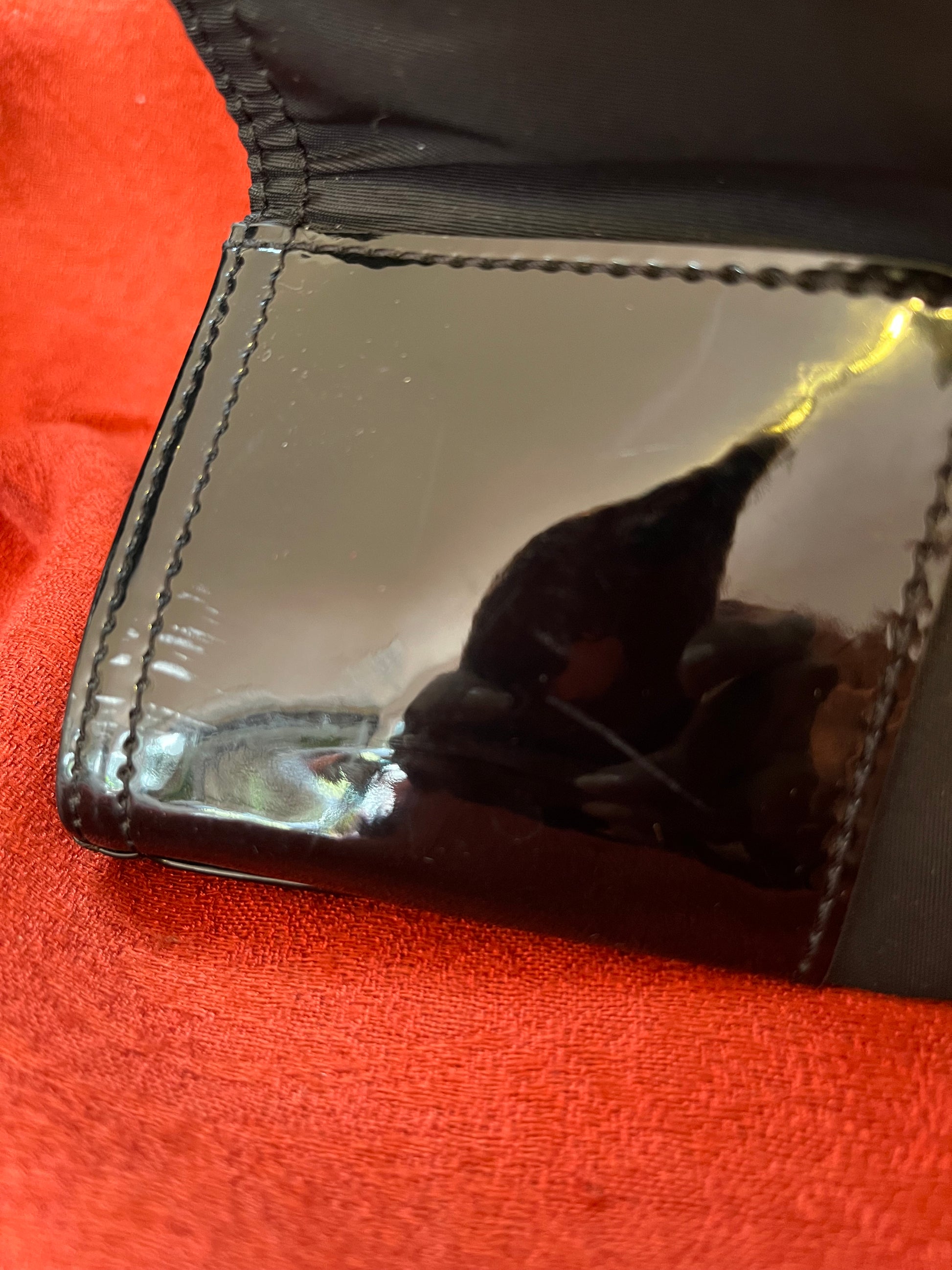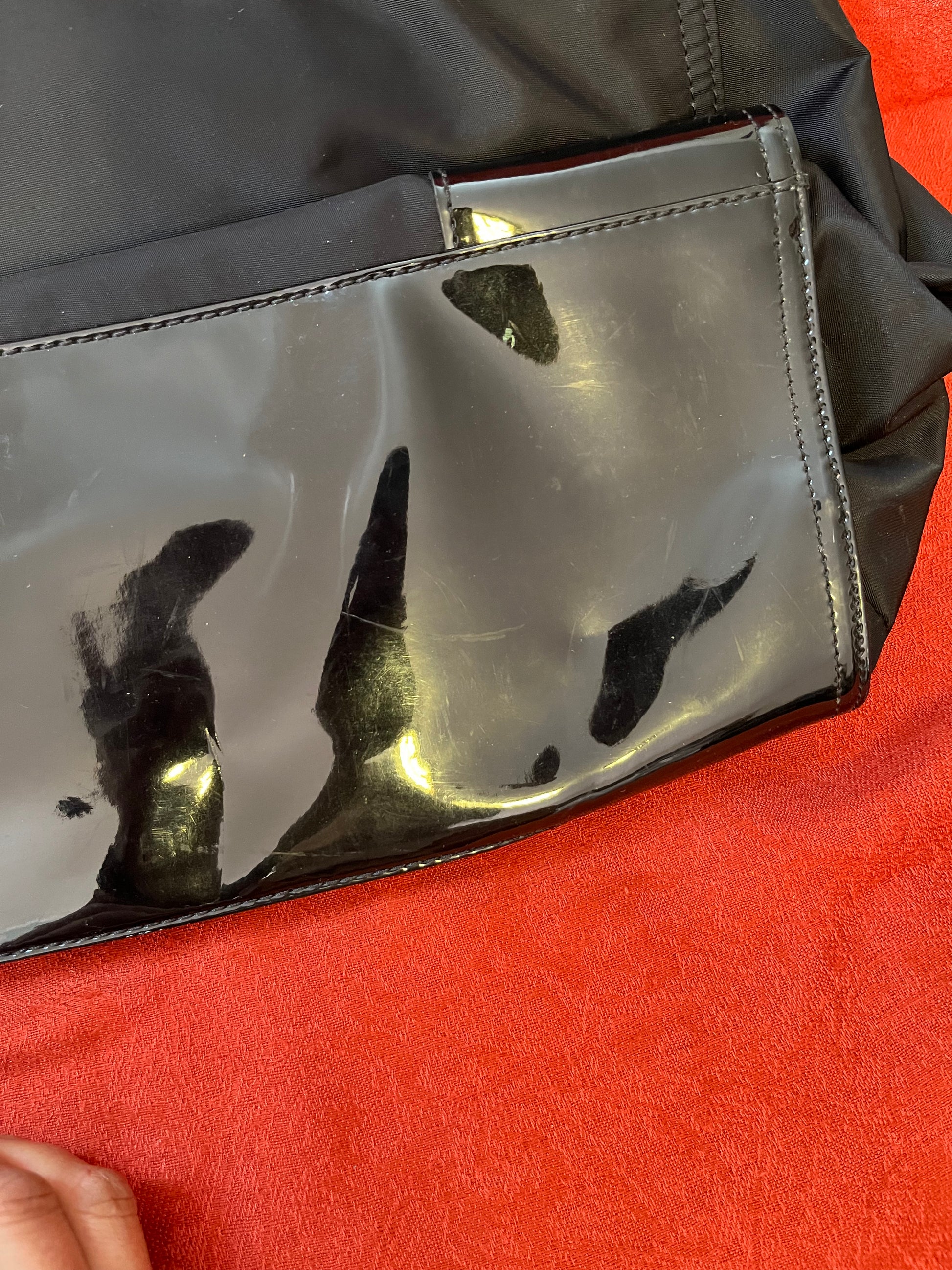 Stylish large black patent leather and nylon Tory Burch. Tote is lined with beige canvas and patent leather trim. One large zip pocket with Tory Burch emblem and two smaller pockets (see pics). Tote is in better than good condition with very minor wear (see pics). Tote measures 16.5 x 13 (with handle measures 20 inch) x 6.